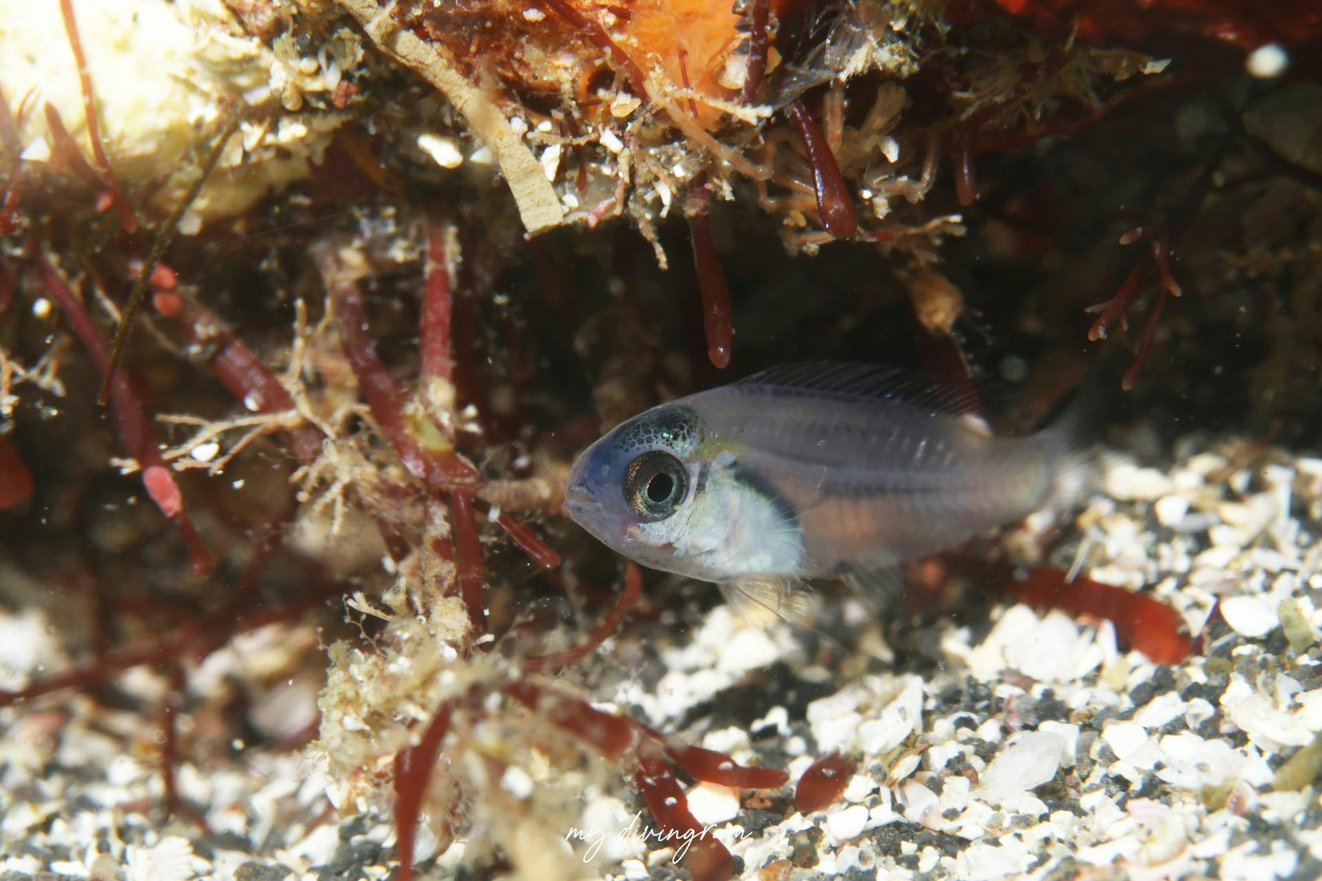 まだスケスケですが、おそらくソラスズメダイの稚魚でしょう!