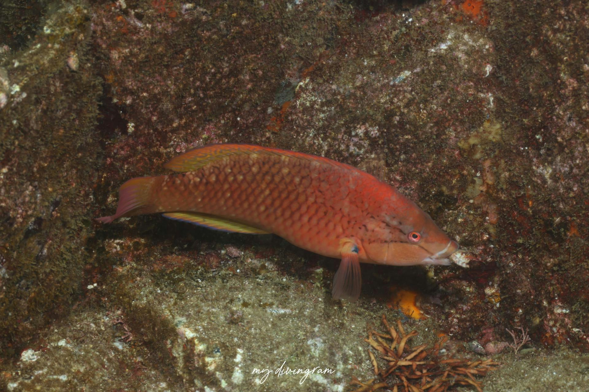 アカササノハベラのオスが何かを咥えてメスに持っていっては振られ、別のメスに持って行っては振られを繰り返していました。