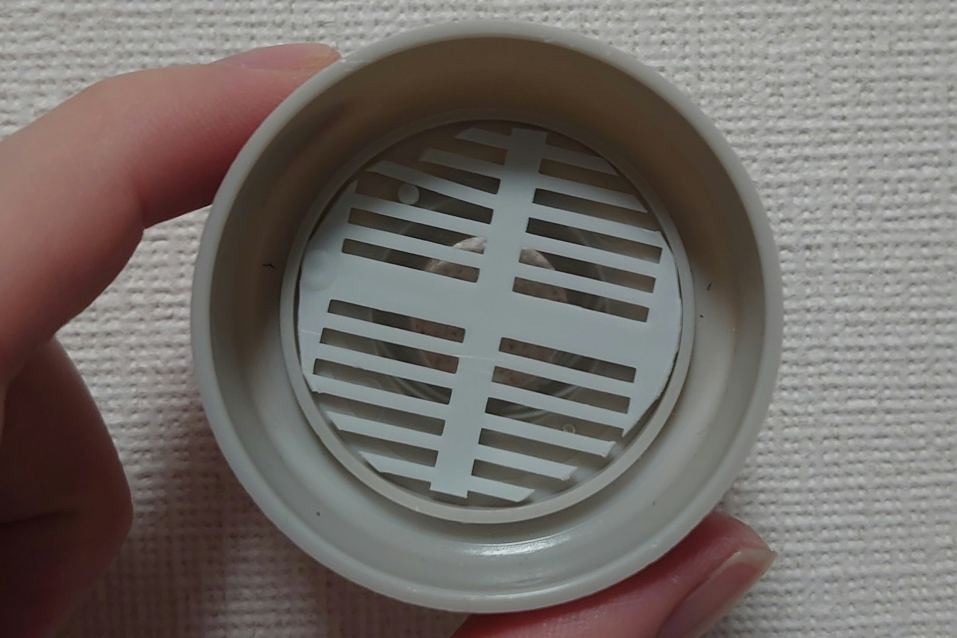 そこで、100均で買ってきた排水溝フィルターを駆使して、ペットボトルつぶし器の中に支えとして固定するという暴挙に出ました。