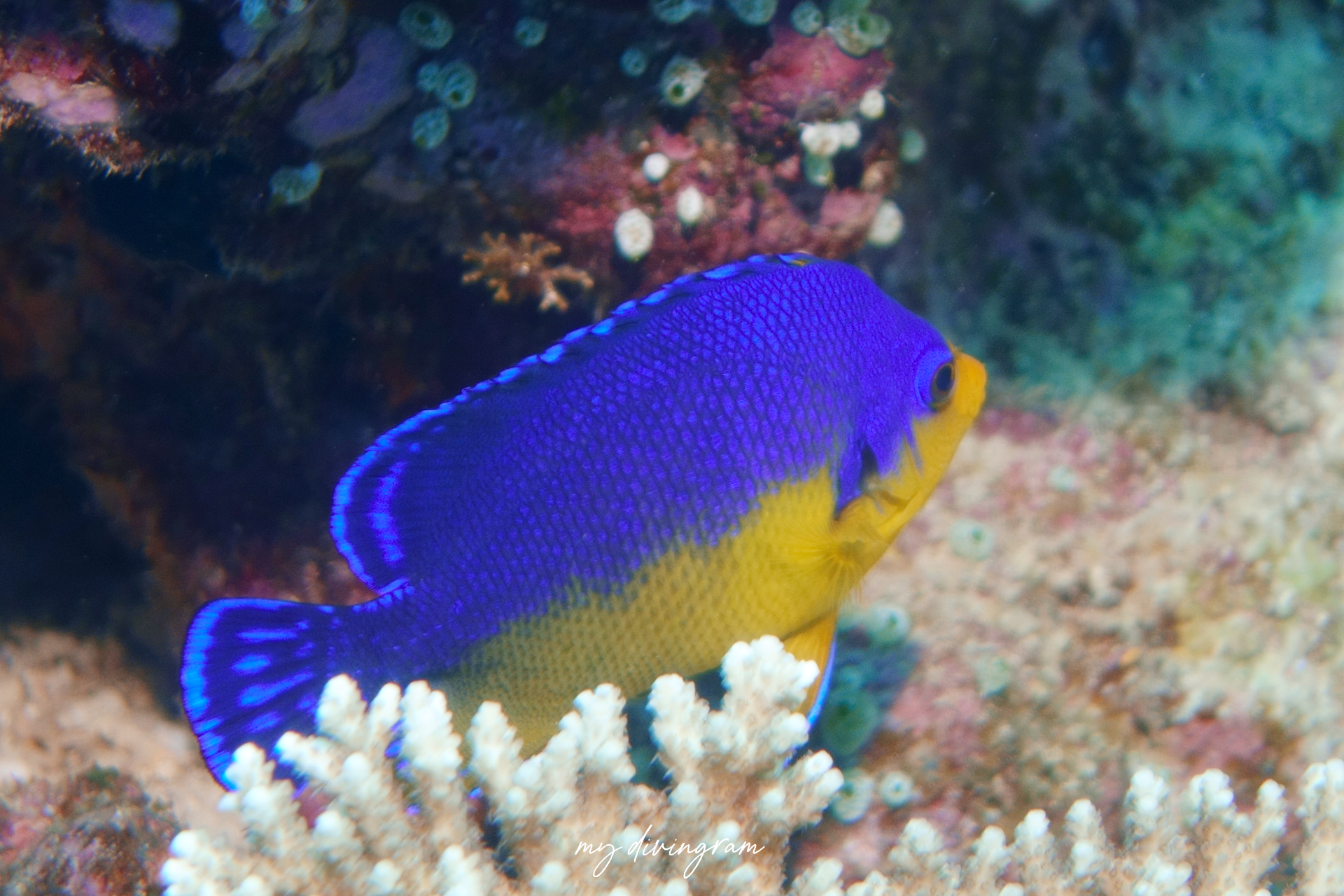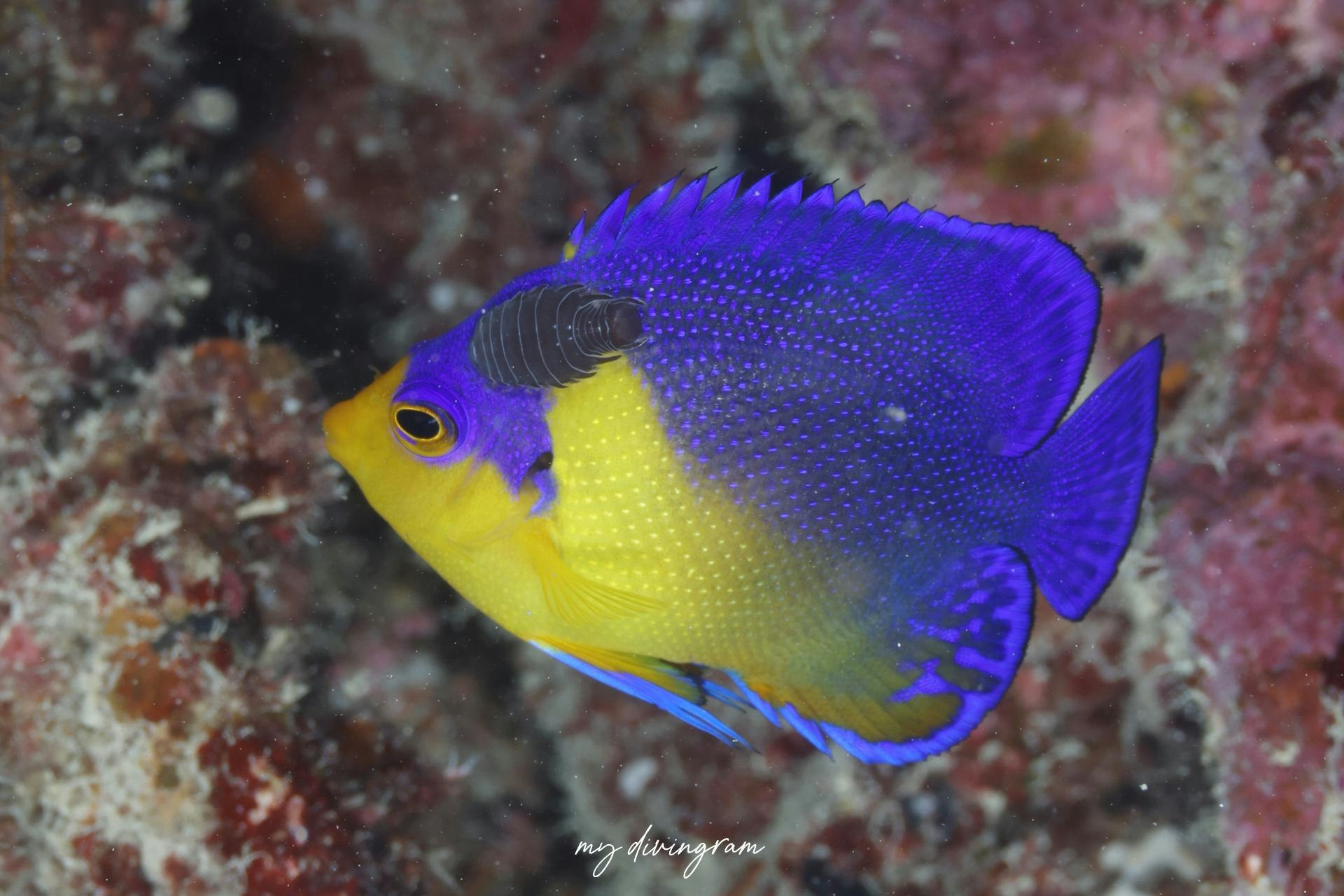 青と黄色のエンゼルといえばソメワケヤッコかこのスミレヤッコでしょう。