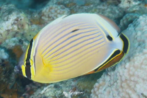 黄色の体色に紫色の細い斜線が多数走るのが特徴です。