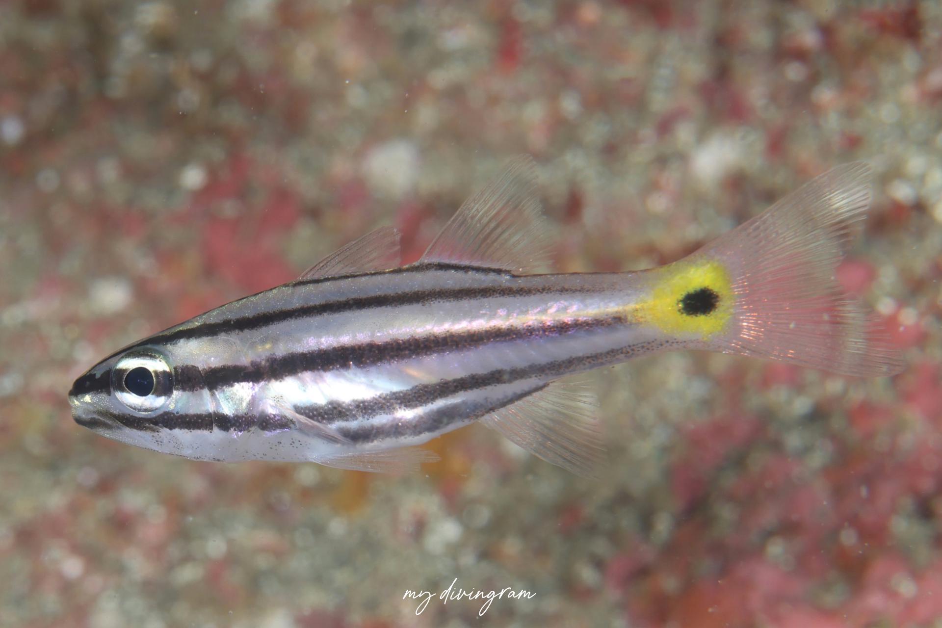 幼魚は尾柄部が黄色く、くっきりとした黒色斑があるのが特徴です。