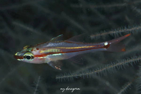 カブラヤテンジクダイは透明感のある体に、体の中心を通る赤色縦帯が特徴です。