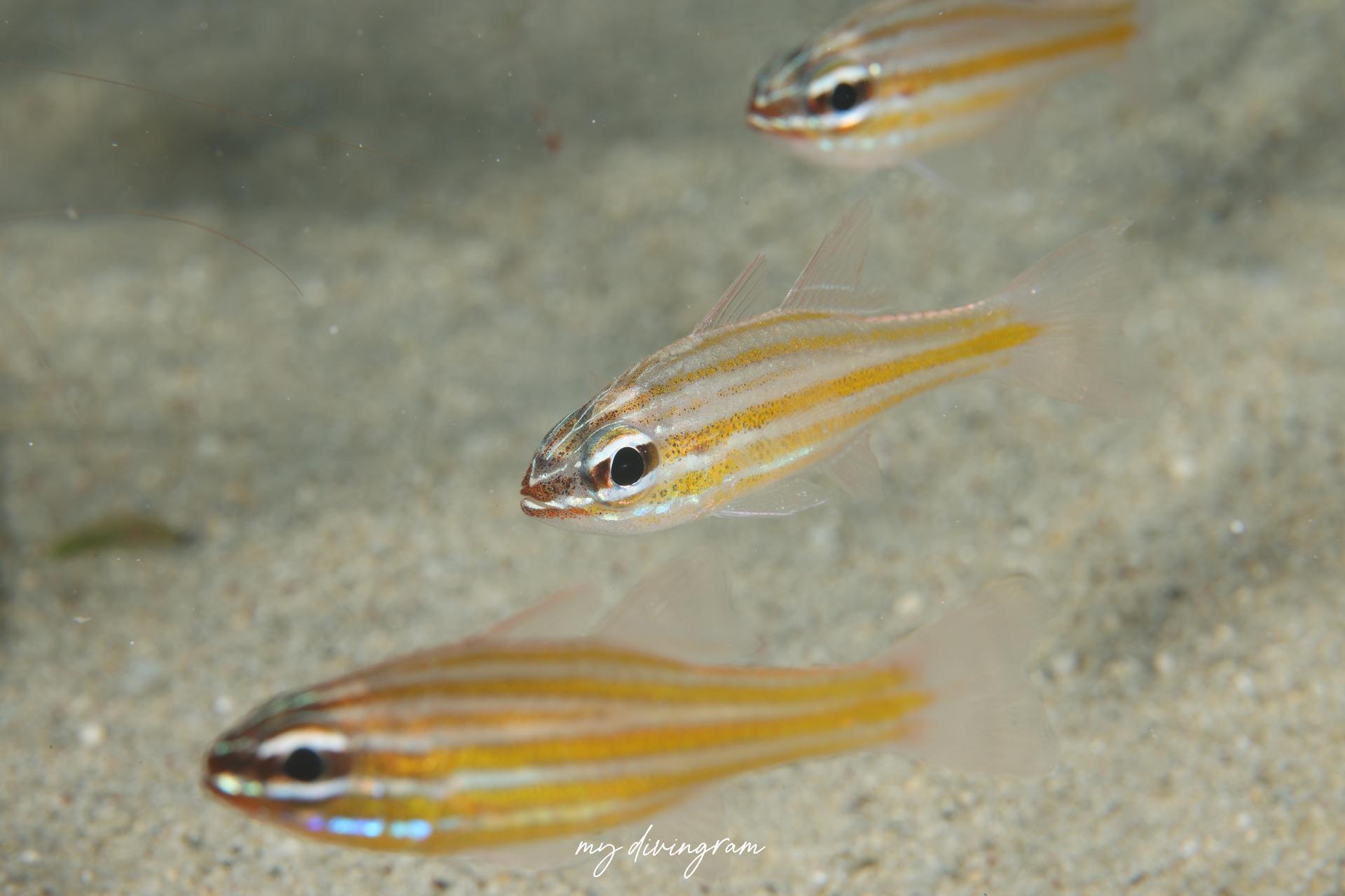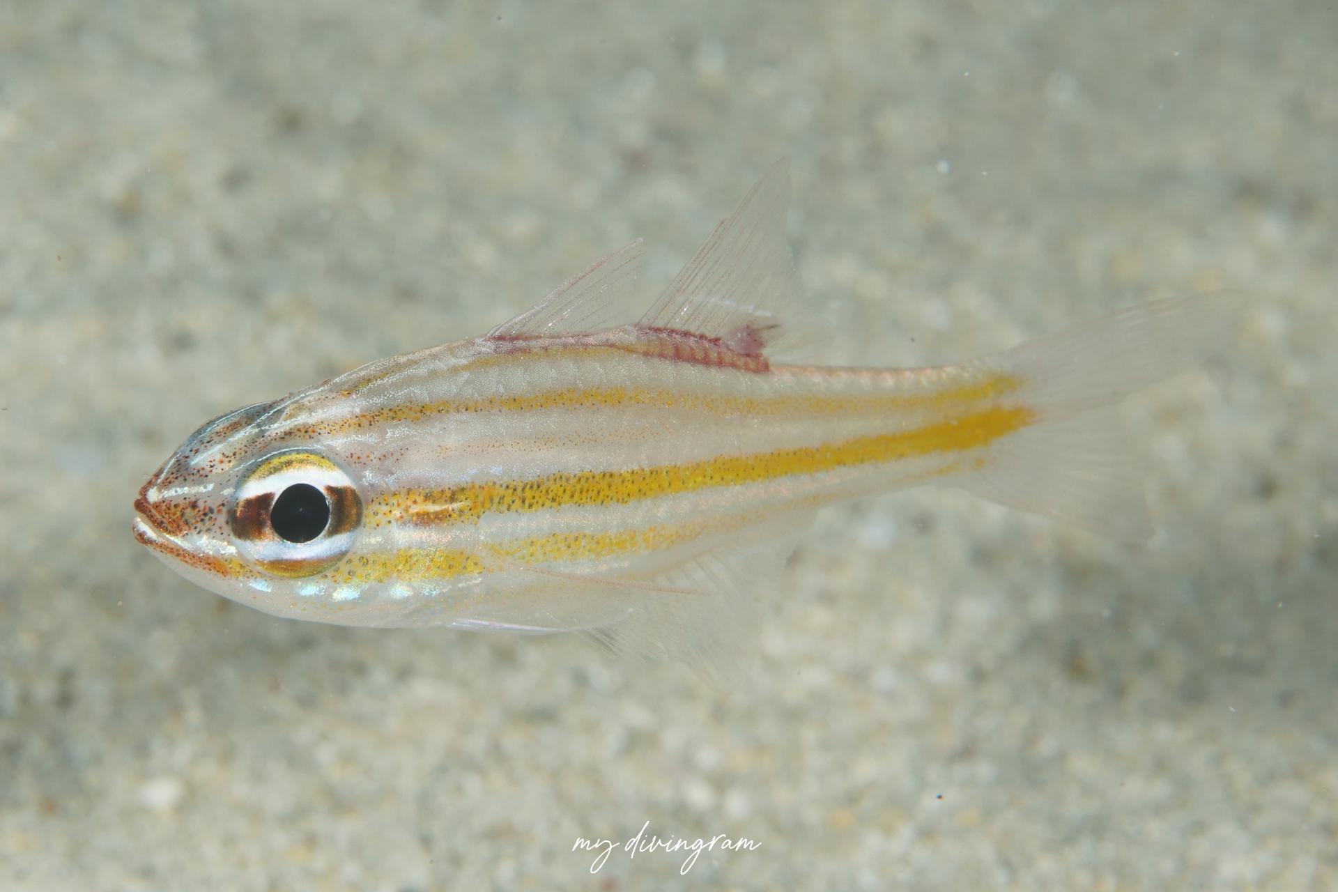 よく似たスジオテンジクダイとは目の下のラインが繋がっていること、尾鰭中央まで黄色線が伸びないことで見分けられます。