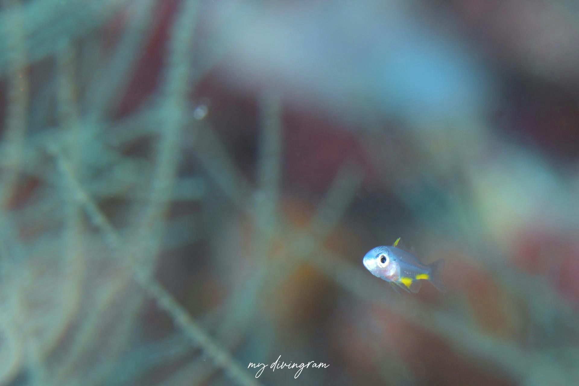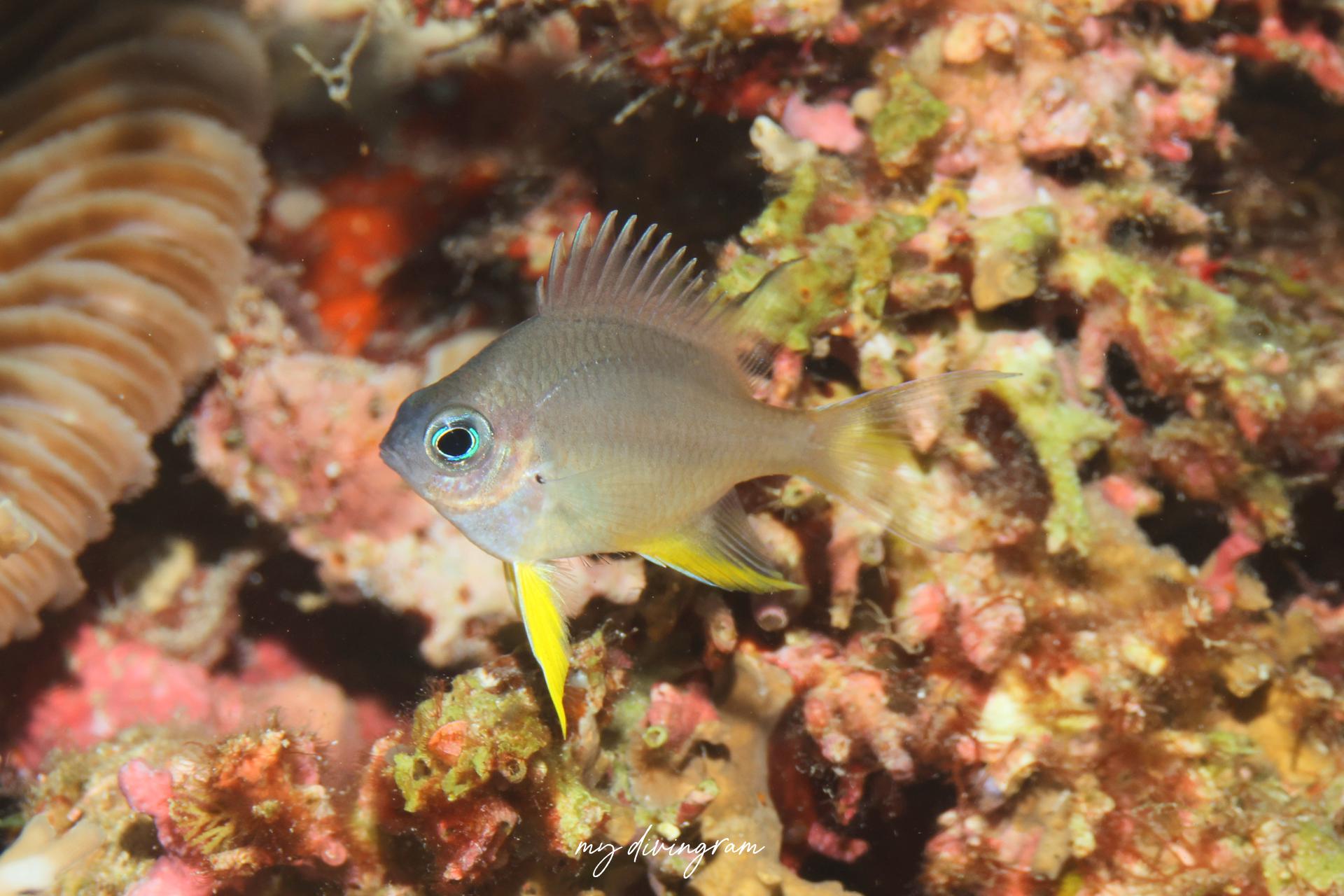 成魚は腹鰭が黄色く背鰭棘と臀鰭が黒いのが特徴のスズメダイです。