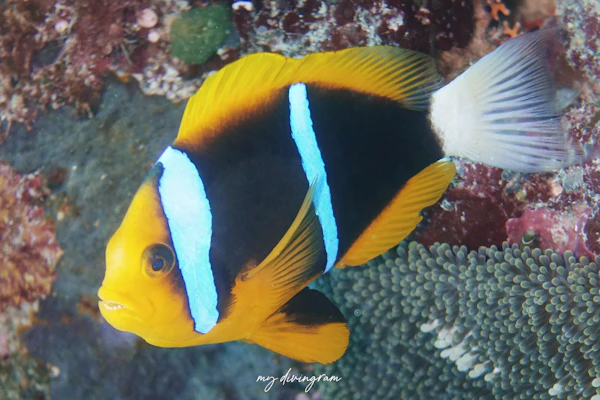 クマノミによく似ていますが、体の2本目の白色横帯が細いのが特徴です。