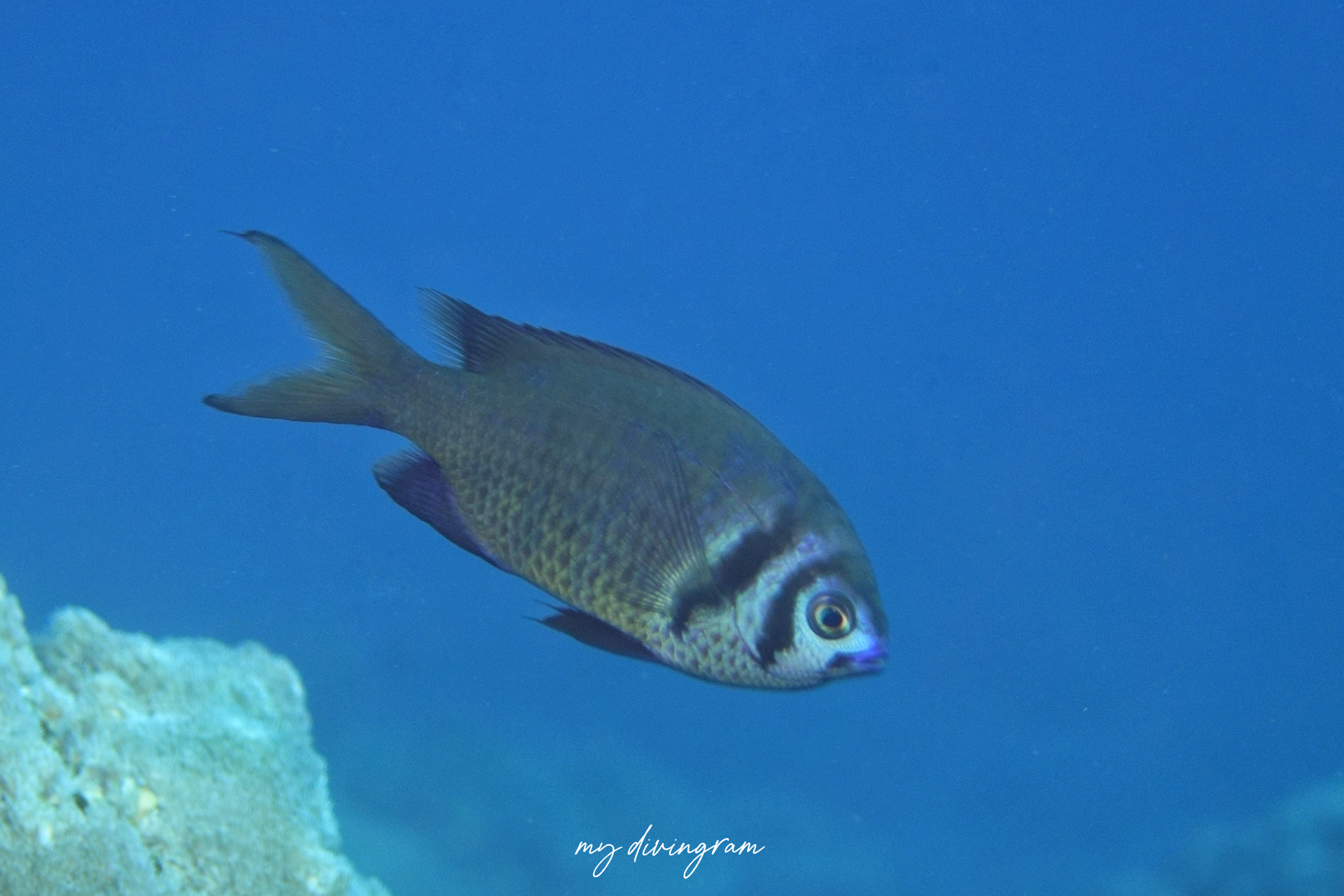 モンスズメダイと酷似していますが、眼のすぐ後方の黒い帯が太いです。