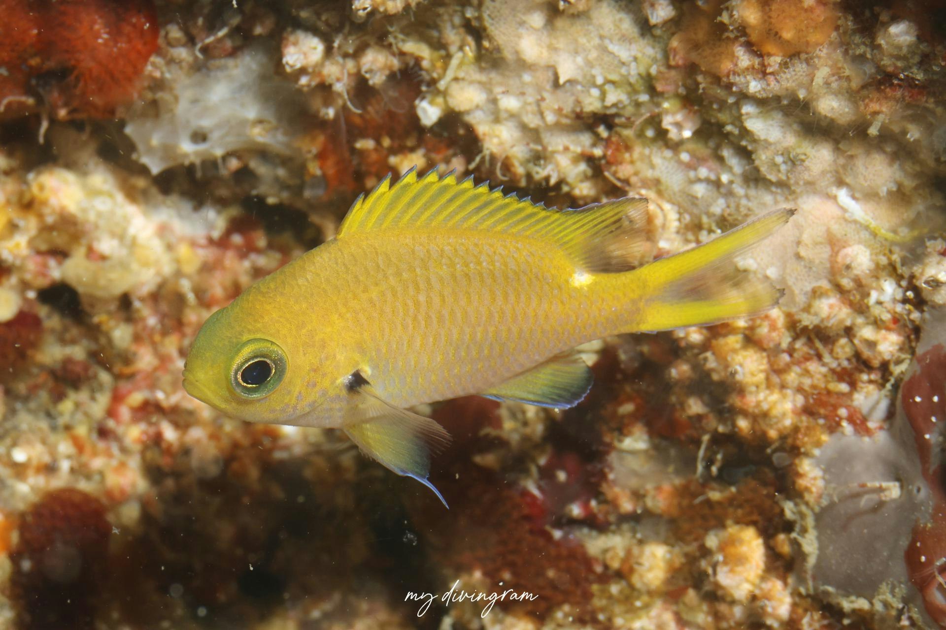 幼魚は全身がくすんだ黄色なことで地味な色のキホシスズメダイの幼魚と見分けられます。