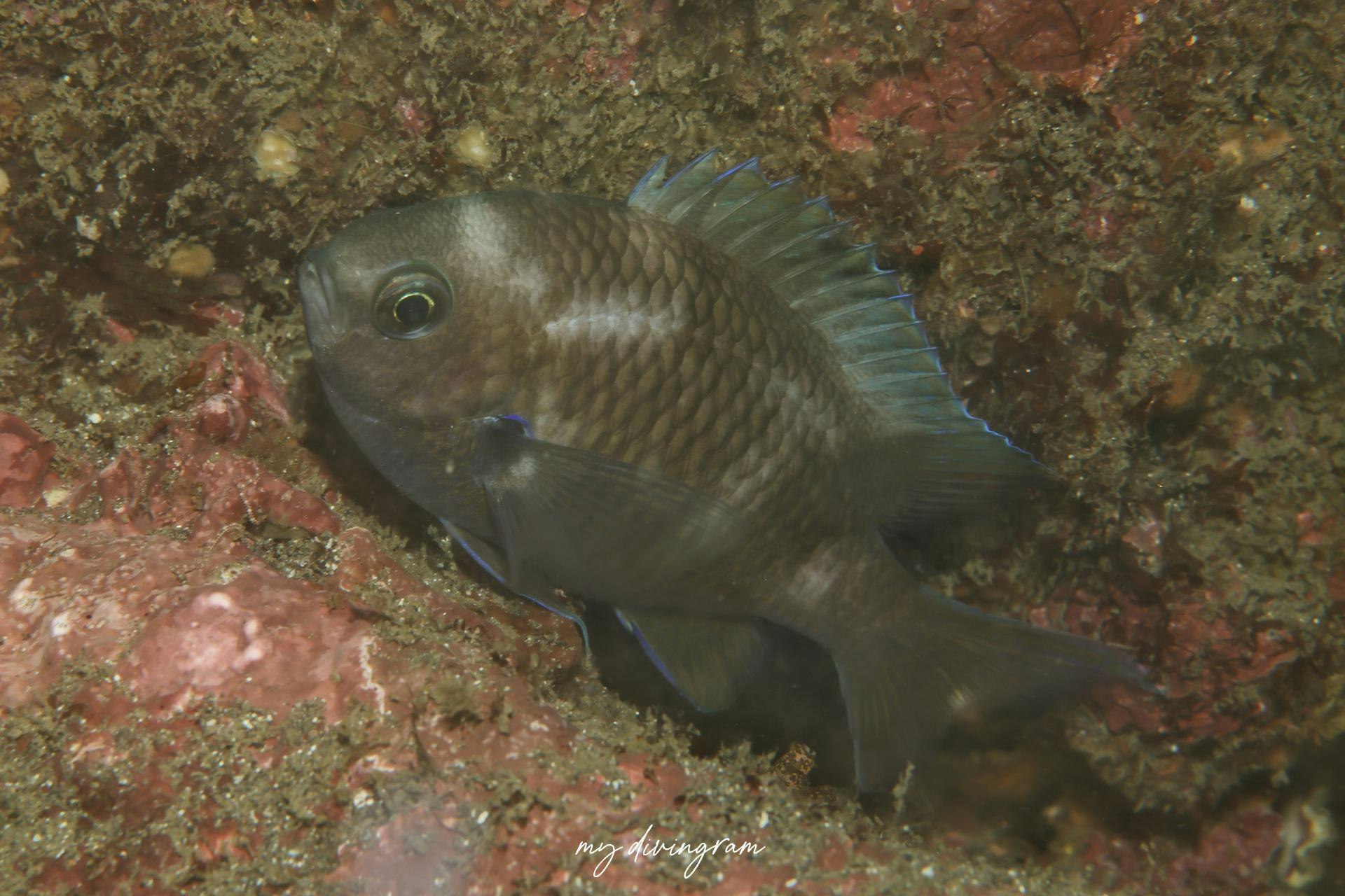 ナノハナスズメダイとよく似ていますが、臀鰭が黒くないことで見分けることができます。(たぶん)