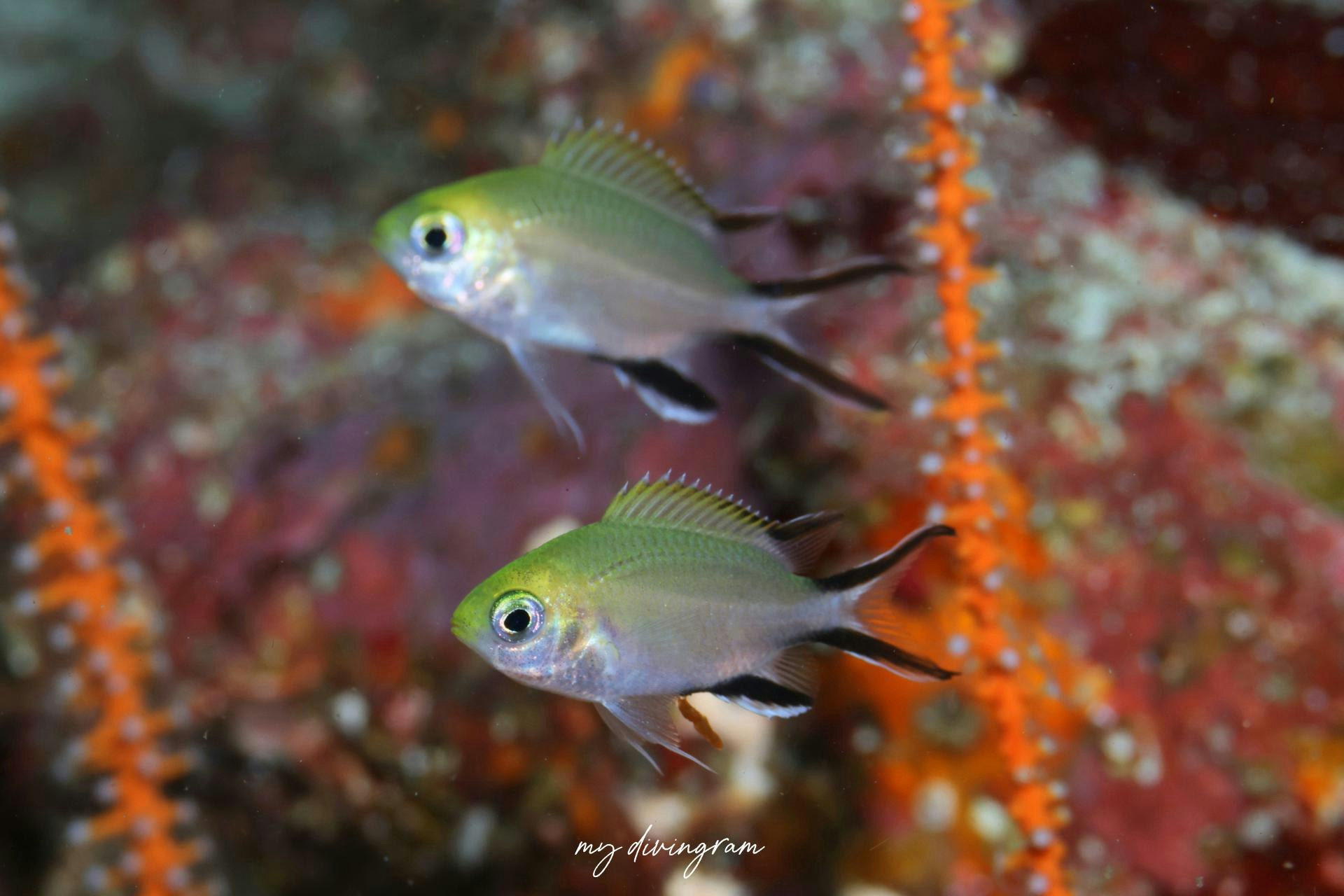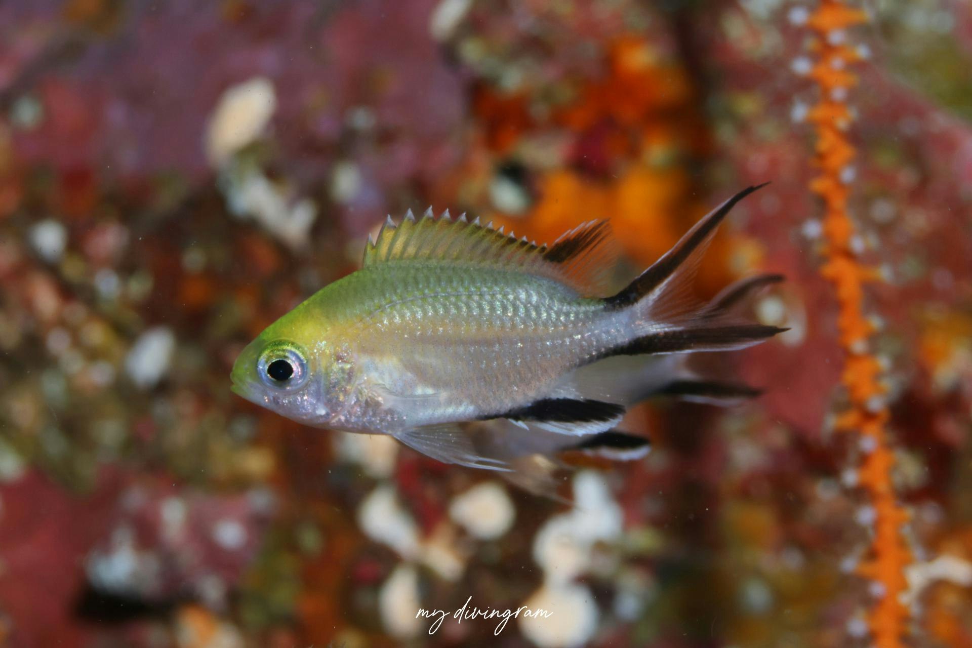 YUMAさん曰く、背鰭棘条部や臀鰭の色彩、生息水深がフィリピンクロミスとは異なるので、Chromis guntingではないかと教えていただきました。