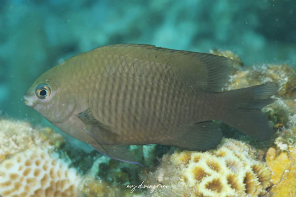 アイスズメダイやヨロンスズメダイ、イシガキスズメダイに似ていますが、背鰭棘条数が13で背鰭棘条部中央下の側線上方鱗数が2.5なことで見分けられます。