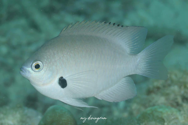 ニセモンツキスズメダイとよく似ていますが、尾鰭の縁が黒くならないことから見分けられます。