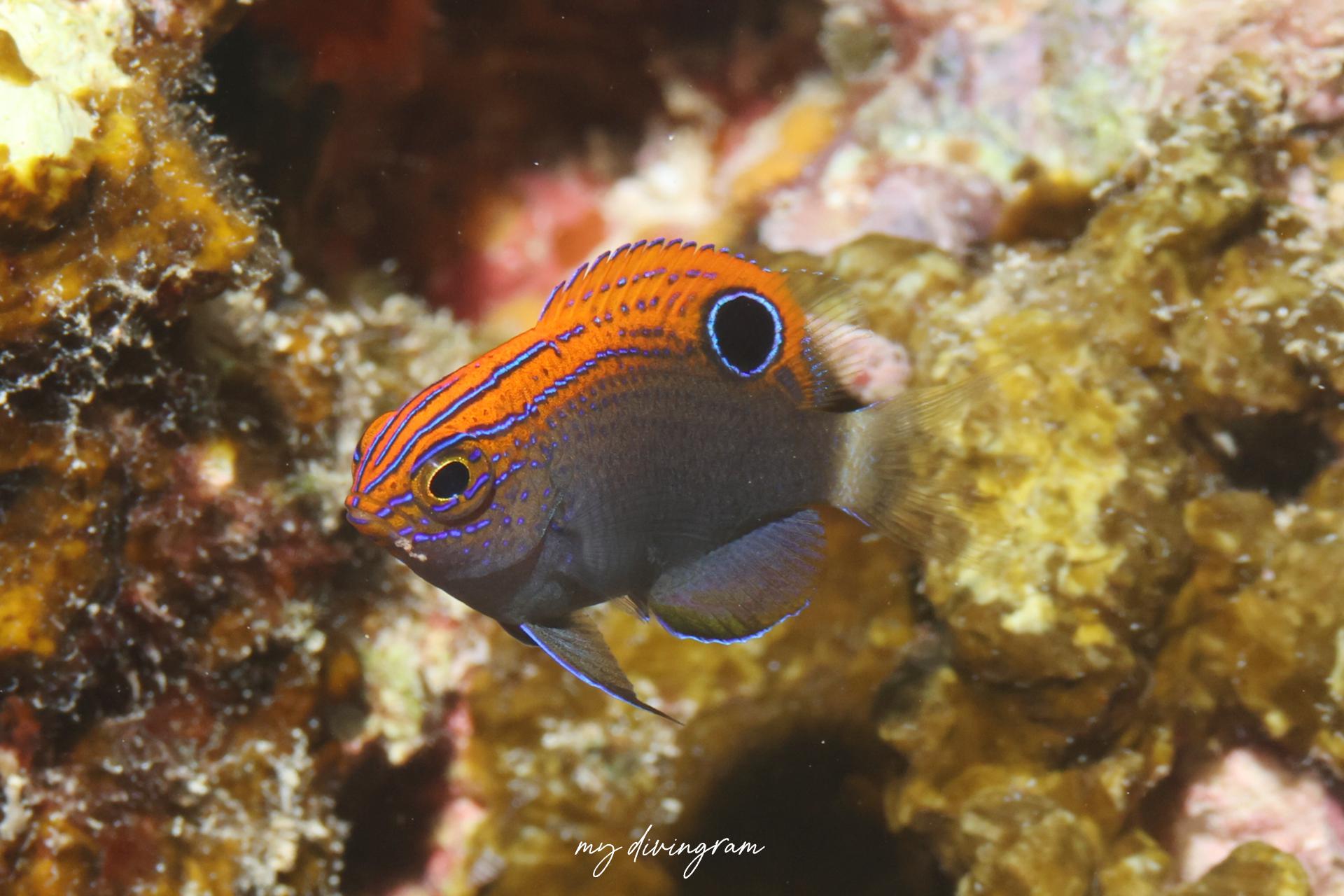 幼魚は尾鰭に白帯があり、眼に線がかかることでオジロスズメダイやクロメガネスズメダイと見分けられます。