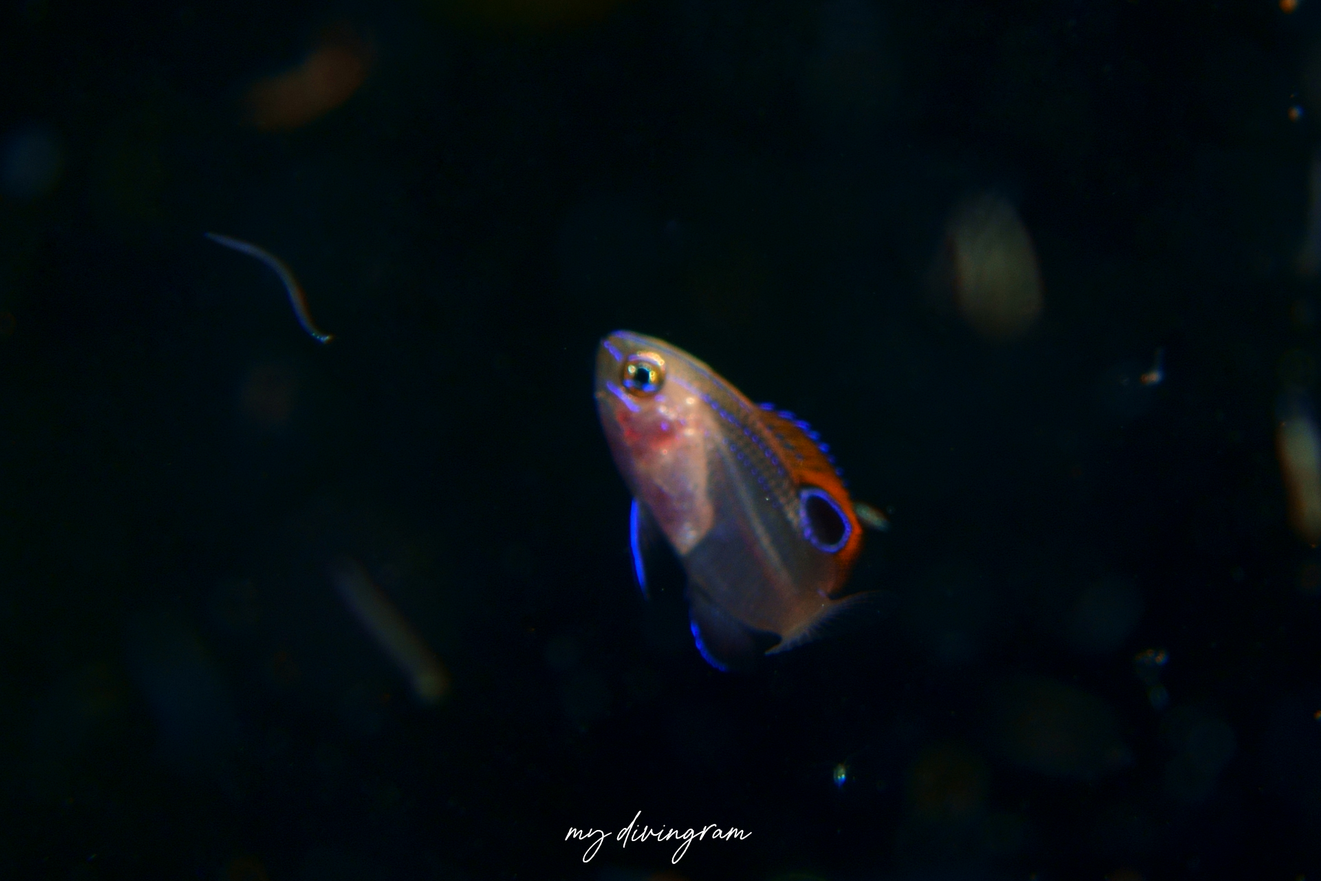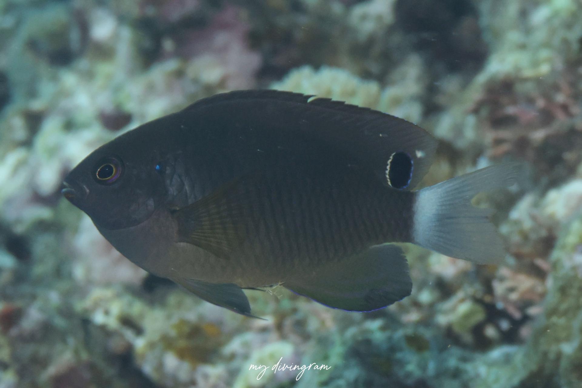 成魚はオジロスズメダイとよく似ていますが、鰓蓋上部の黒斑の中にさらに輝く青色斑があることで見分けられます。