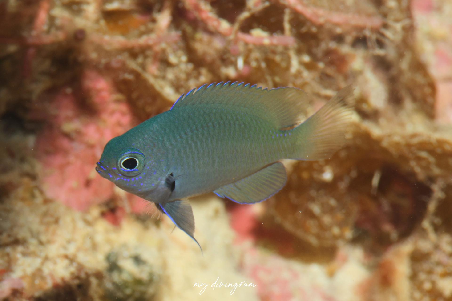 モンツキスズメダイの幼魚よりも色がくすんでいます。