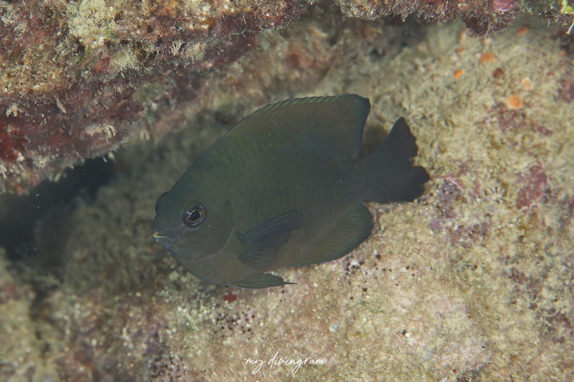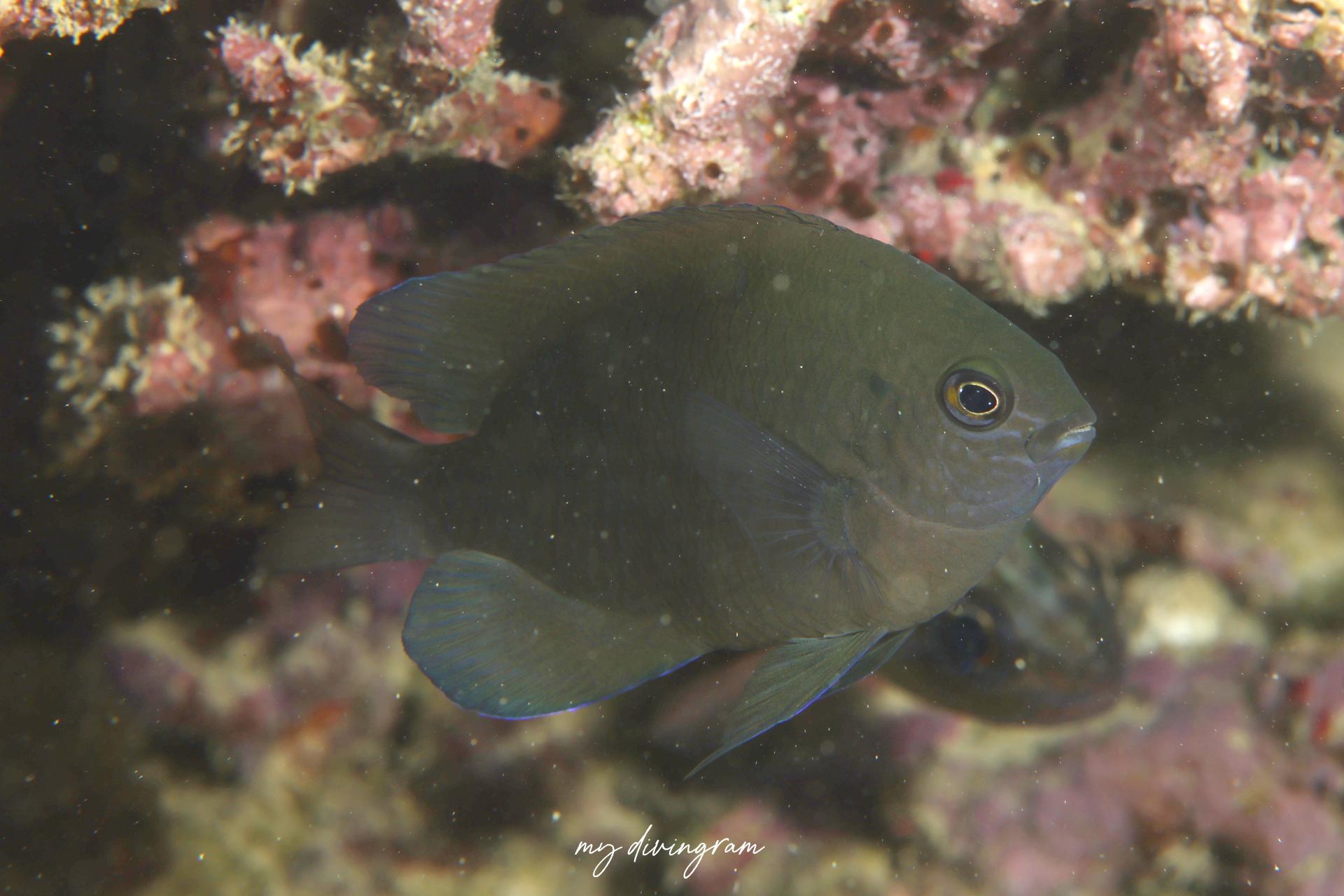 幼魚の頃は分かりやすく頭部に青色線が入っていて、オリオンスズメダイ黒点1つ抜きみたいな見た目をしているので、割と見分けやすいそうです。