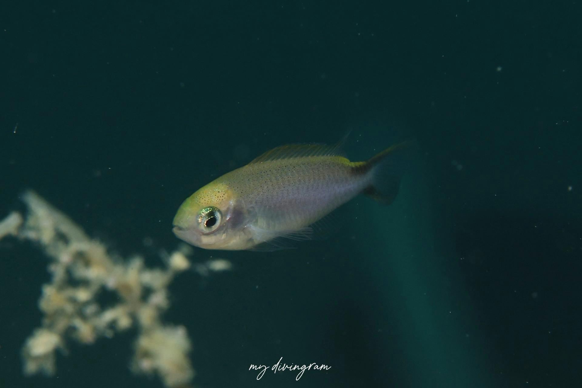 ブイについてました。細長さから違和感を感じていたのですが、オキナワスズメダイで良いようです。