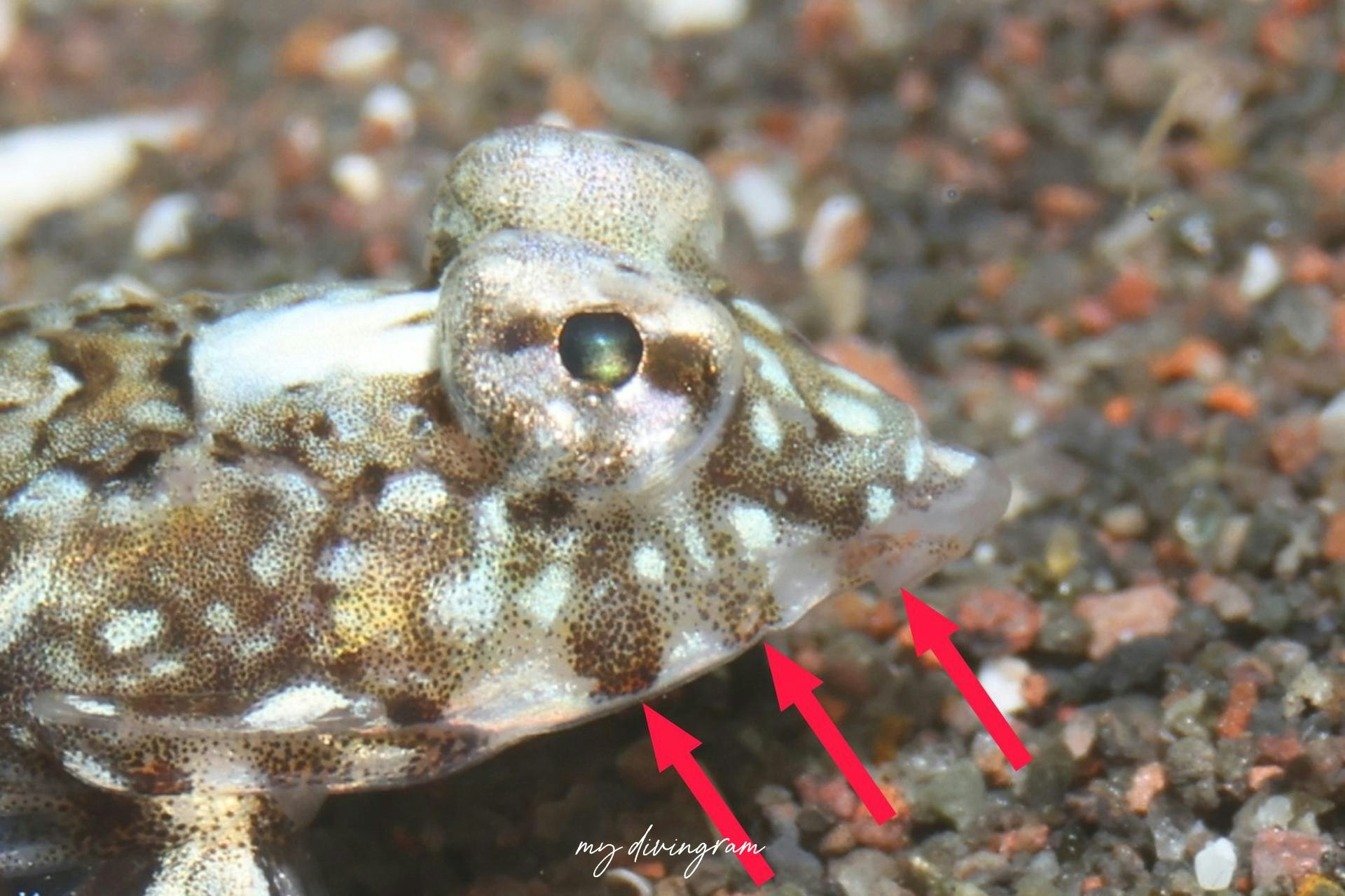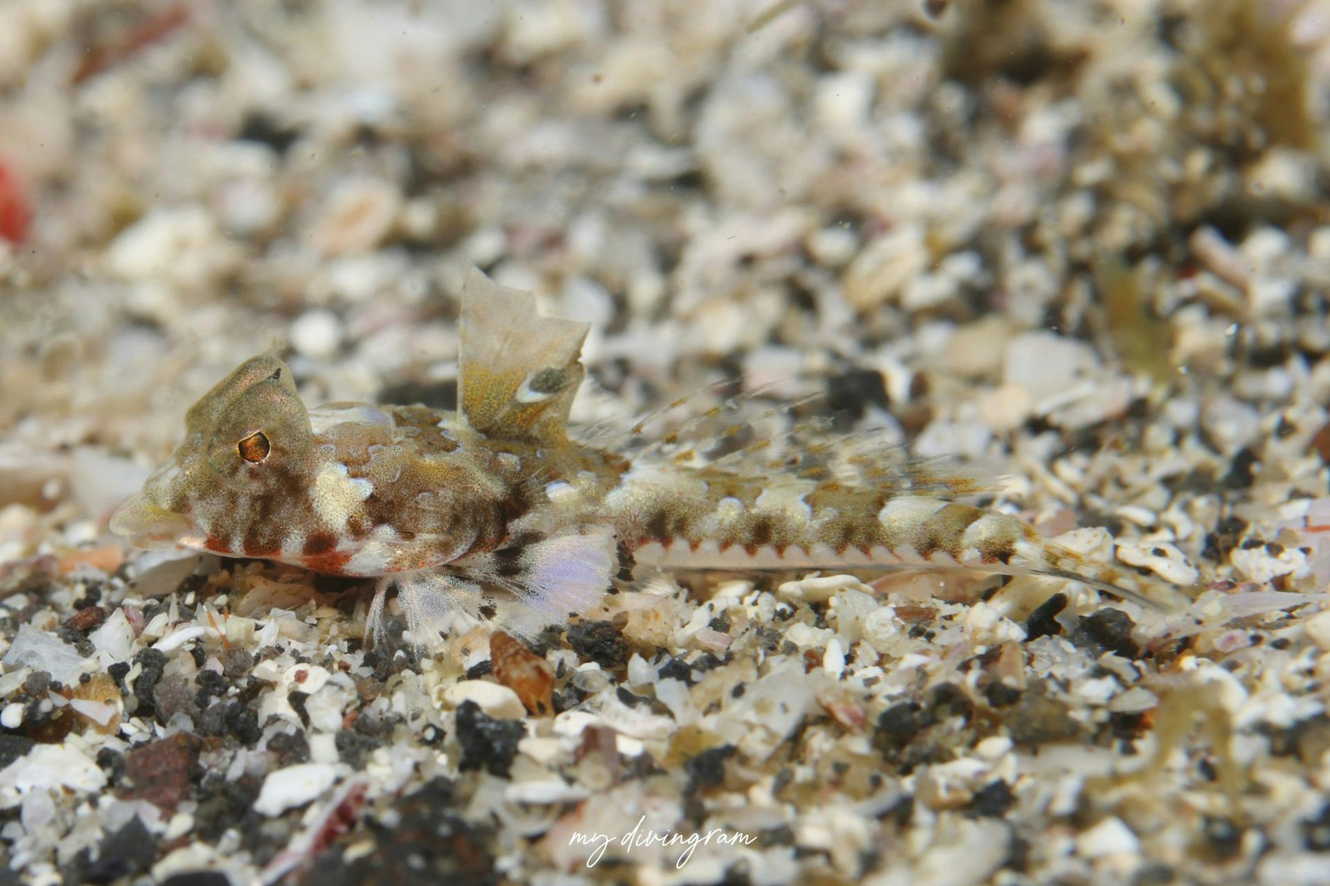 第1背鰭の第3~4棘間に白い縁取りのある黒色斑が無いように見えるので激レアなイズヌメリの幼魚の可能性もあるとのことでしたが、幼魚なので断定が難しく、大瀬崎ではポピュラーなヨメゴチとして掲載してしまいます。