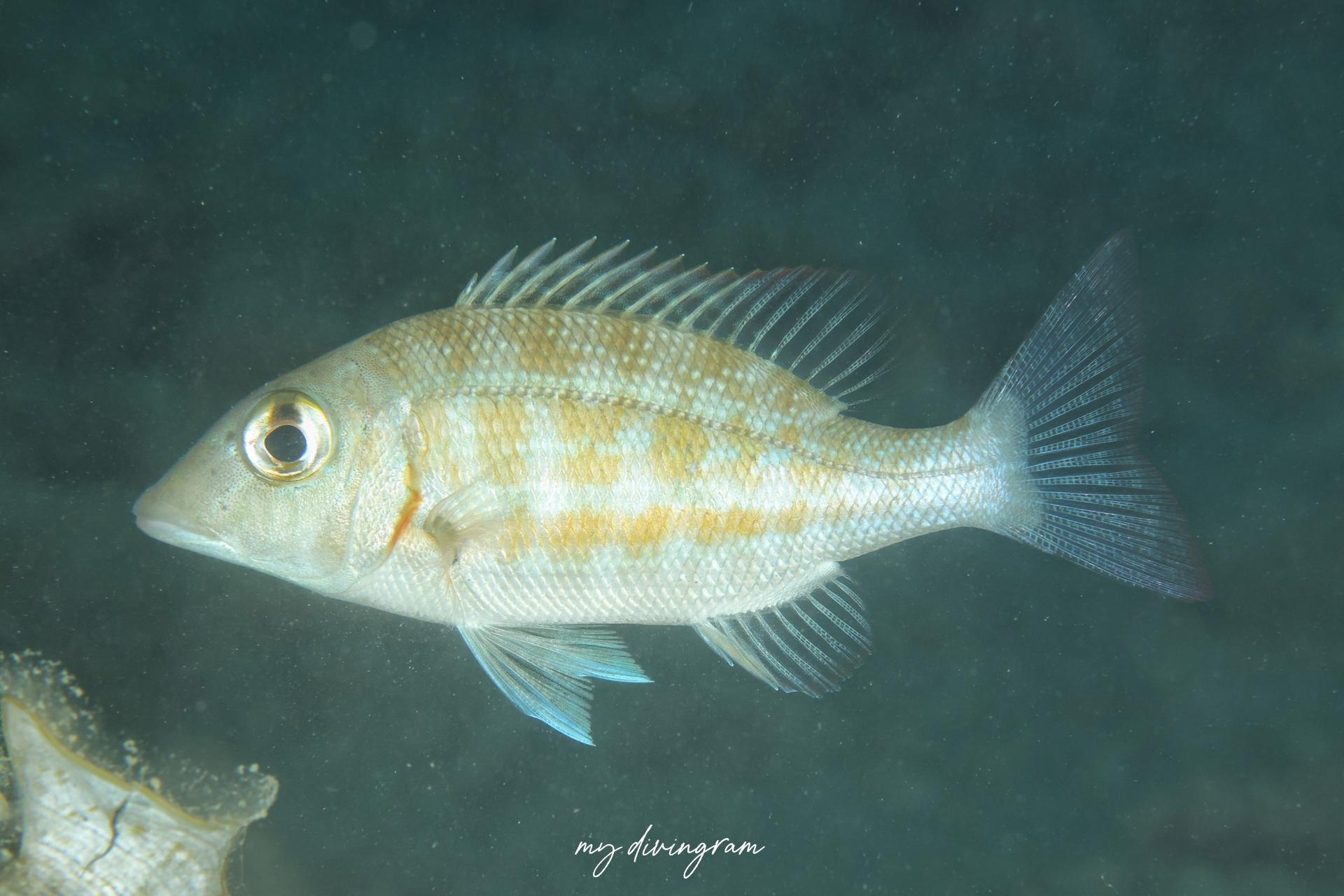 サムネの個体がやや薄いですが、胸鰭のあたりから黄色のラインが1本伸びることで見分けられます。