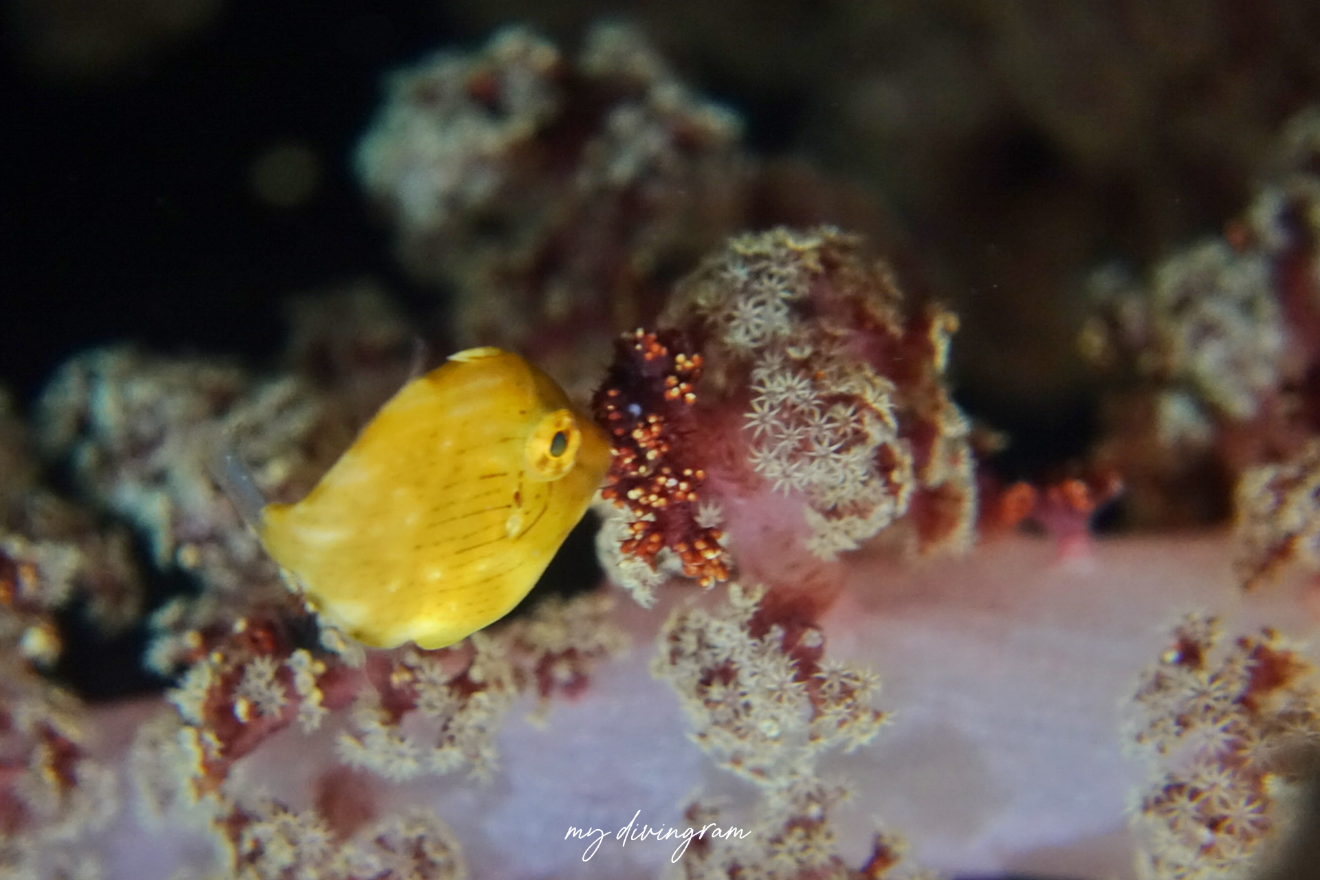 ナイトダイビングでは流されないようにトサカを銜えて寝ている姿を目にできます。