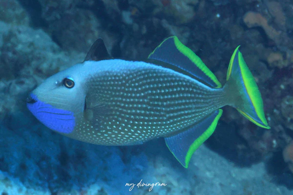 オスは頬が青色で、背鰭と臀鰭は黄色ですが、メスは一様に暗褐色の体色で、背鰭と臀鰭が褐色なのが特徴です。