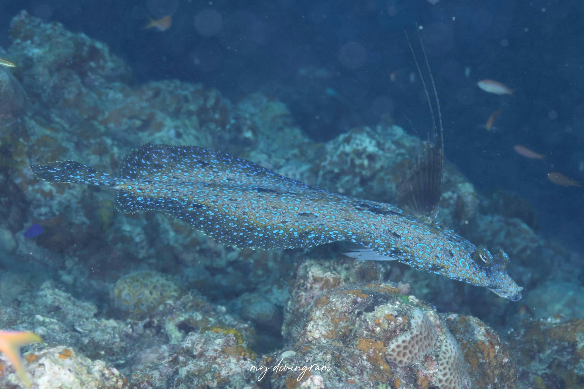 アカネハナゴイが群れている中でモンダルマガレイが突如泳いできて飛び掛かりました。