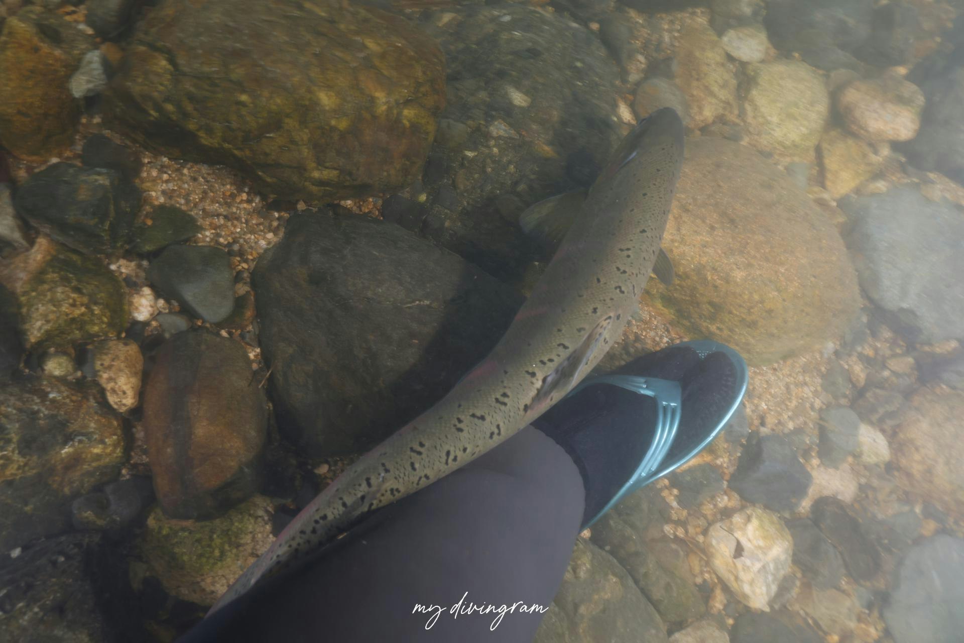この日は前日の大雨の影響で川が増水し、ビワマスたちは産卵モードではなく遡上モードにw