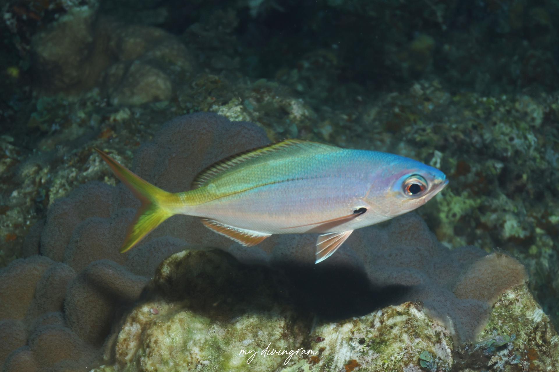 南の海で群れている青と黄色の魚はだいたいこのウメイロモドキです。