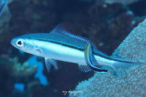 体の縦帯が細いこと、尾鰭の上下葉に黒色帯があることが特徴です。