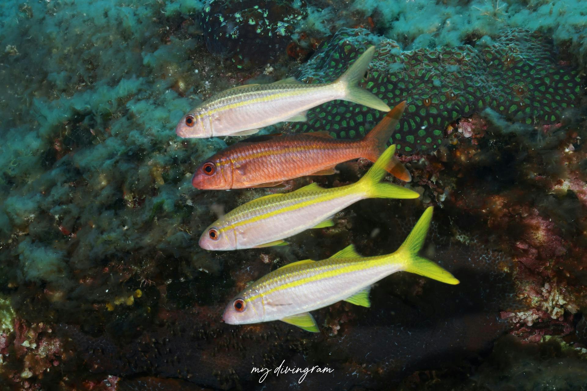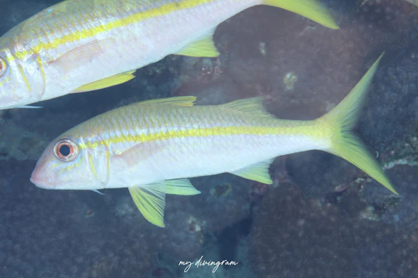 体色は黄色く、体側中央に黄色縦帯が1本あるのが特徴です。