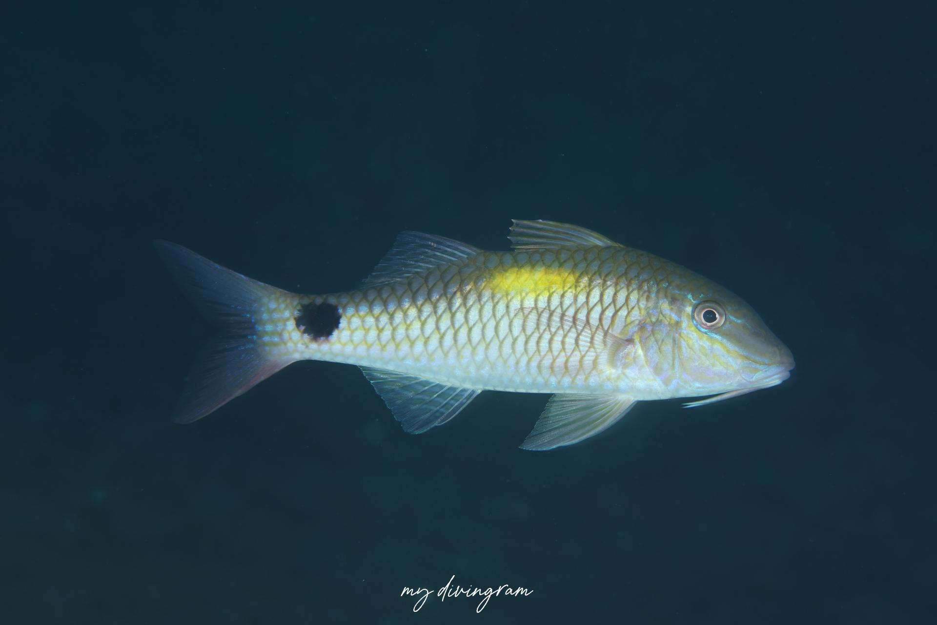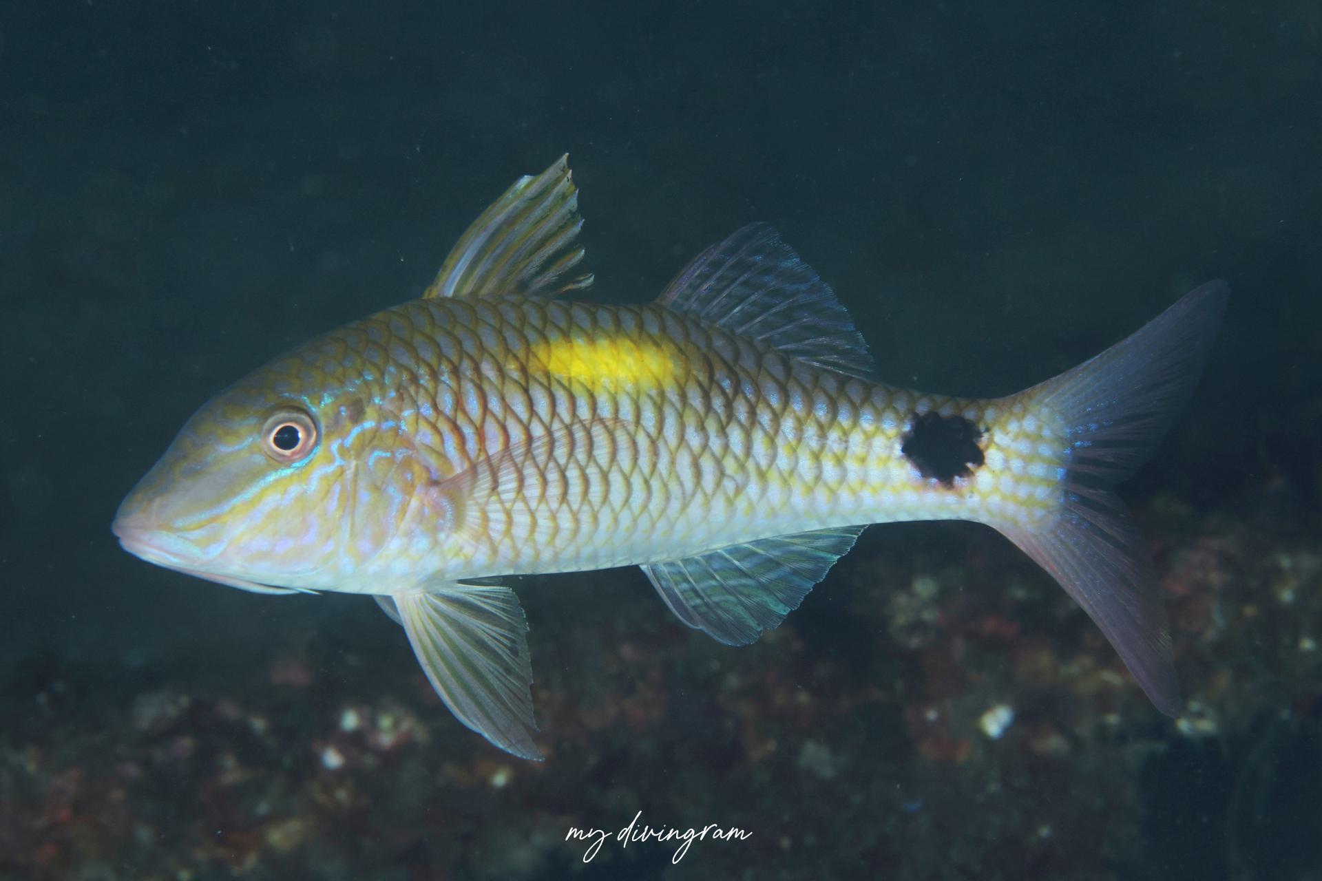 背中にある黄色斑と、尾柄部の黒色斑が特徴のヒメジです。