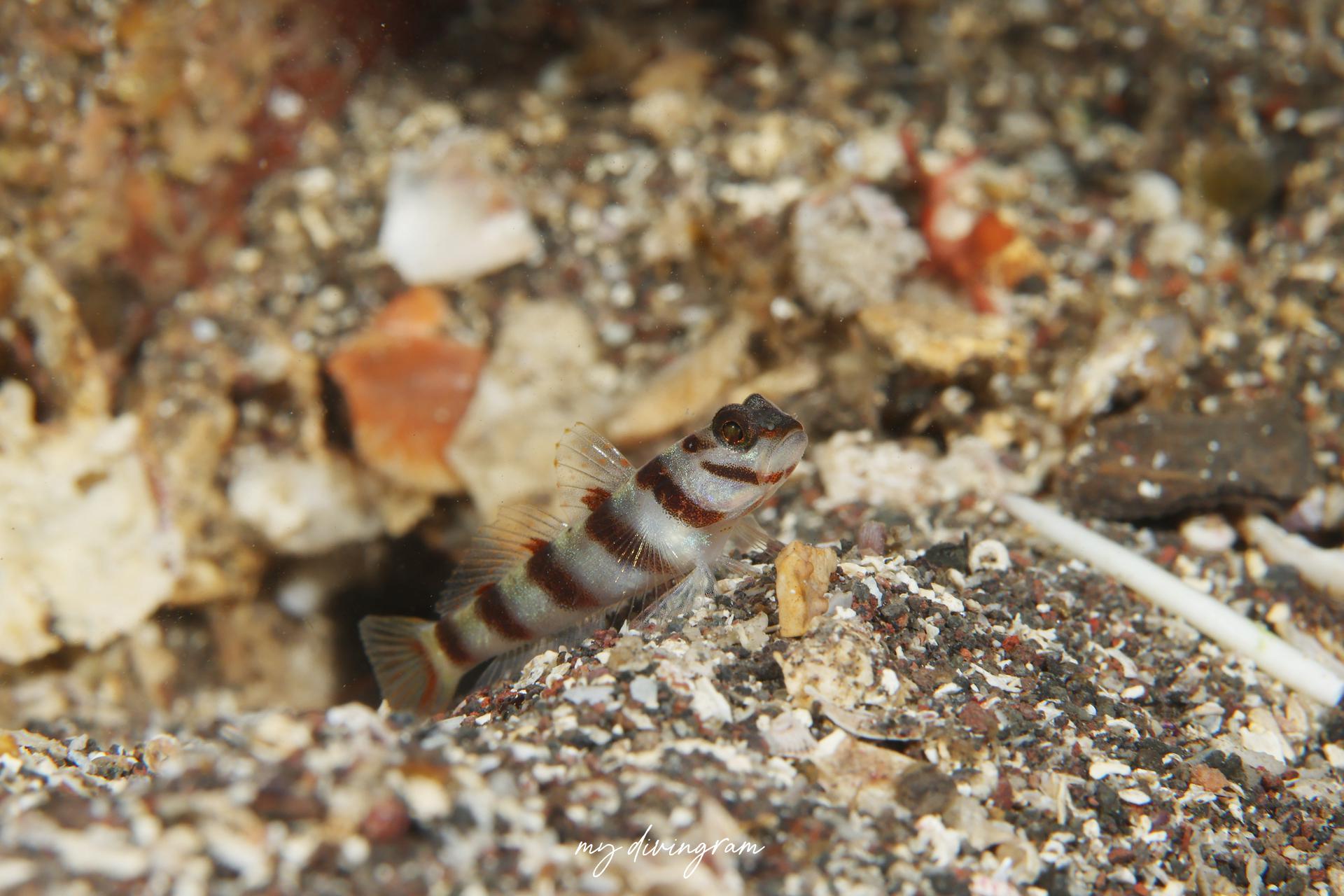 眼の後方に途切れる黒褐色斜線があるのが特徴のハチマキダテハゼ。