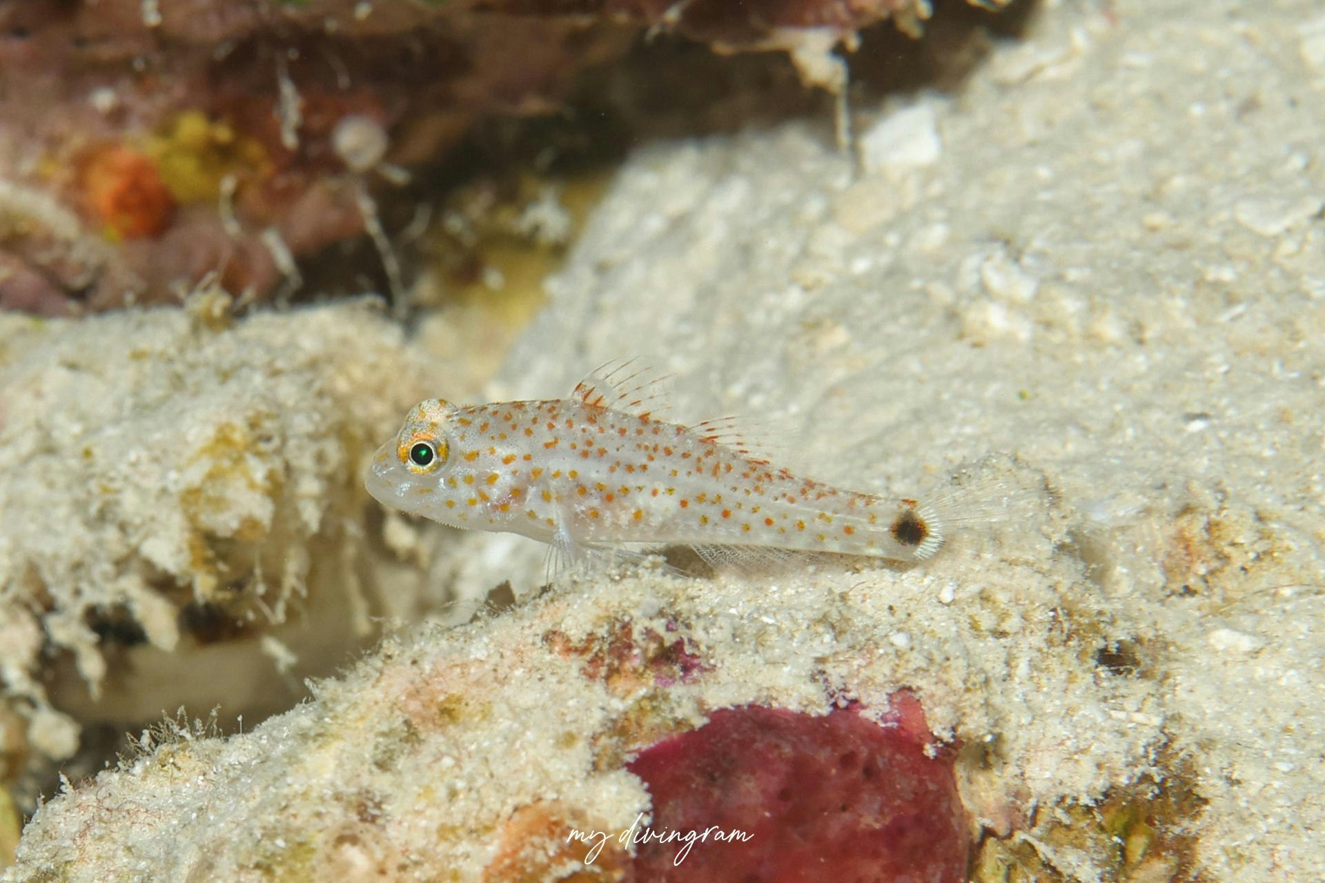 黒色斑が尾柄部のみなのでイッテン!?と思いましたが、第1背鰭に色素胞が見えるのでフタホシホシハゼの幼魚でしょう。