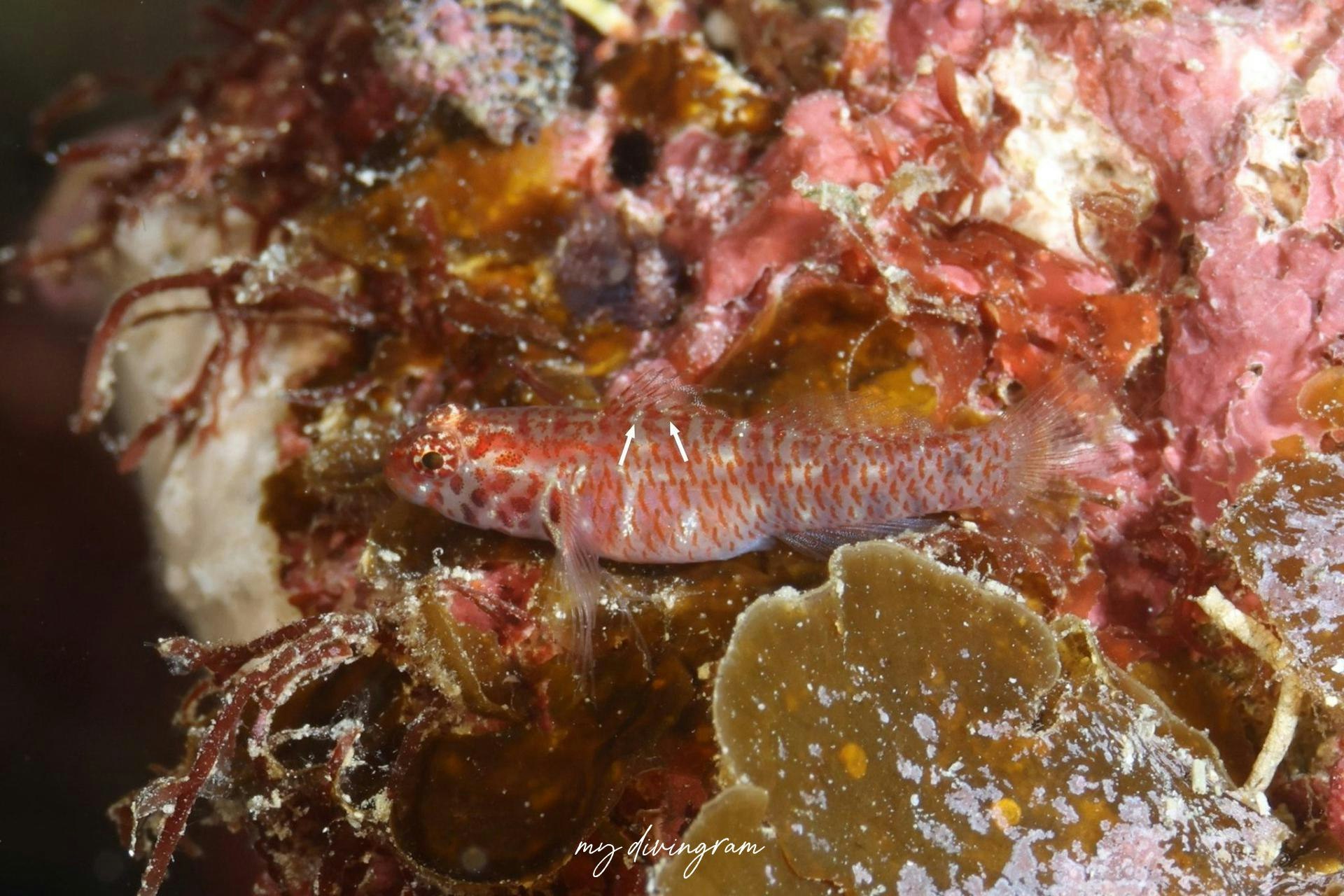 尾柄部の黒色斑が無く、下写真の矢印のように背鰭の基部に半透明の白い円斑が2つあるのが特徴で、ホデリイソハゼの可能性が高いとのことでした!