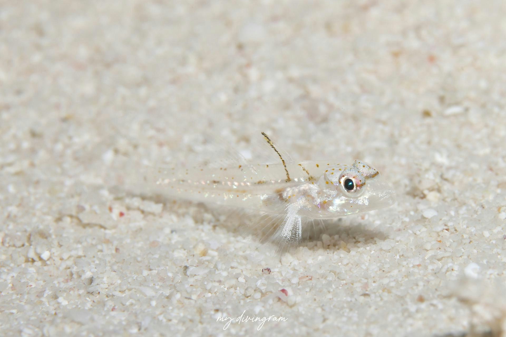 第1背鰭には黒線のみで黒点はないこと、尾鰭の付け根にある黒色斑が丸いことでセホシサンカクハゼと見分けられます。