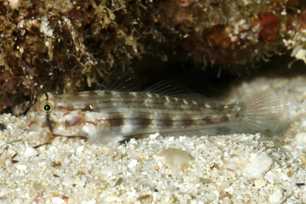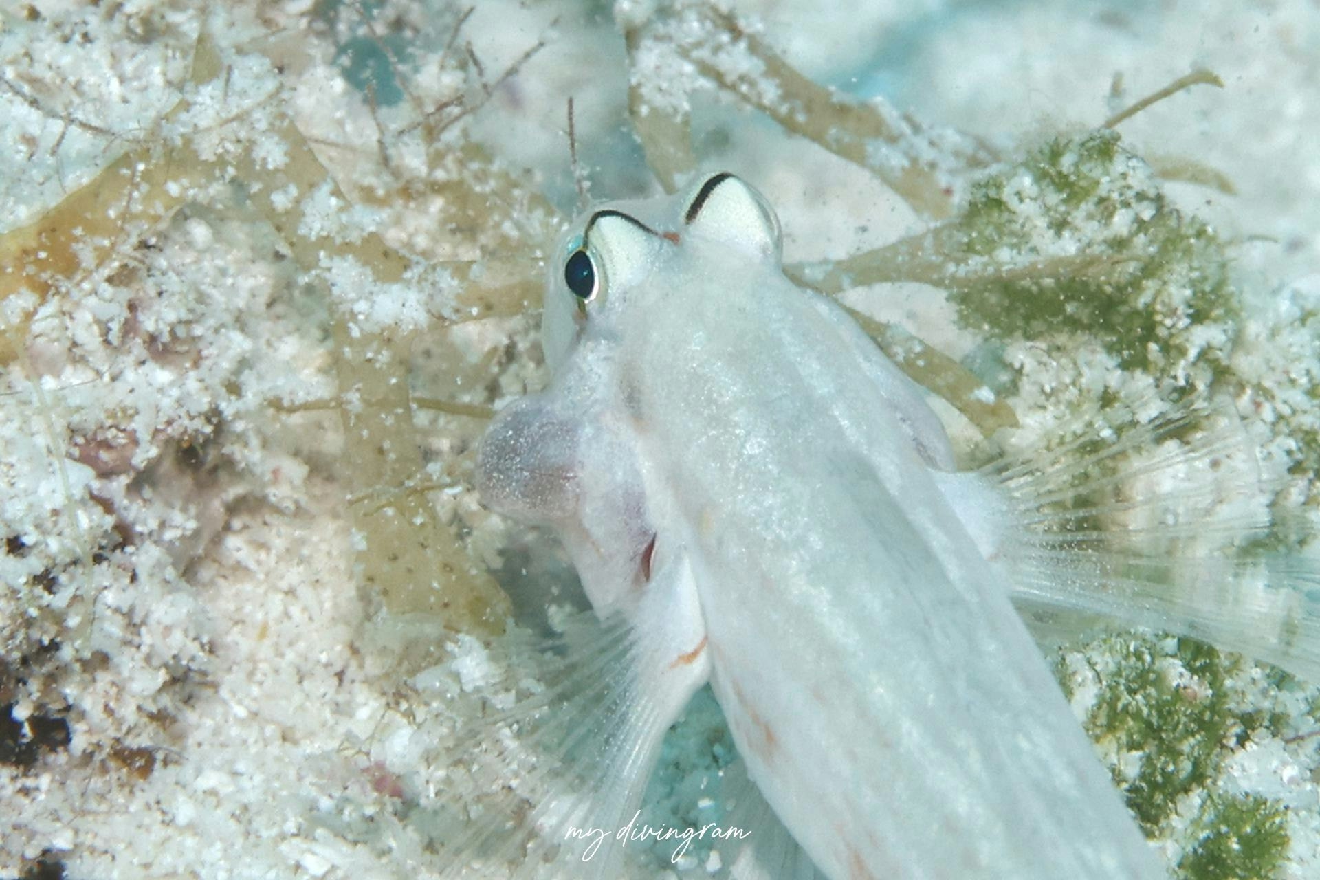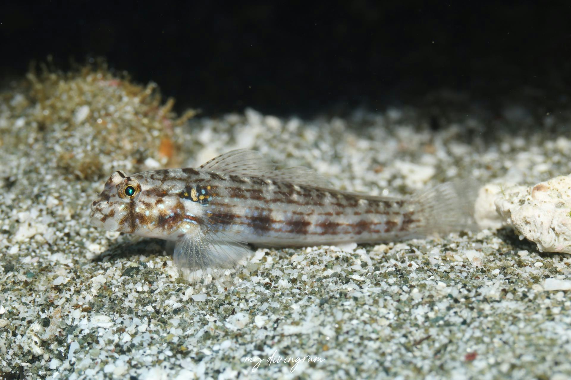 眼を通る垂線があるハゼはだいたいオオモンハゼ属なのですが、ダイビングで見るオオモンハゼ属はだいたいこのカタボシオオモンハゼです。