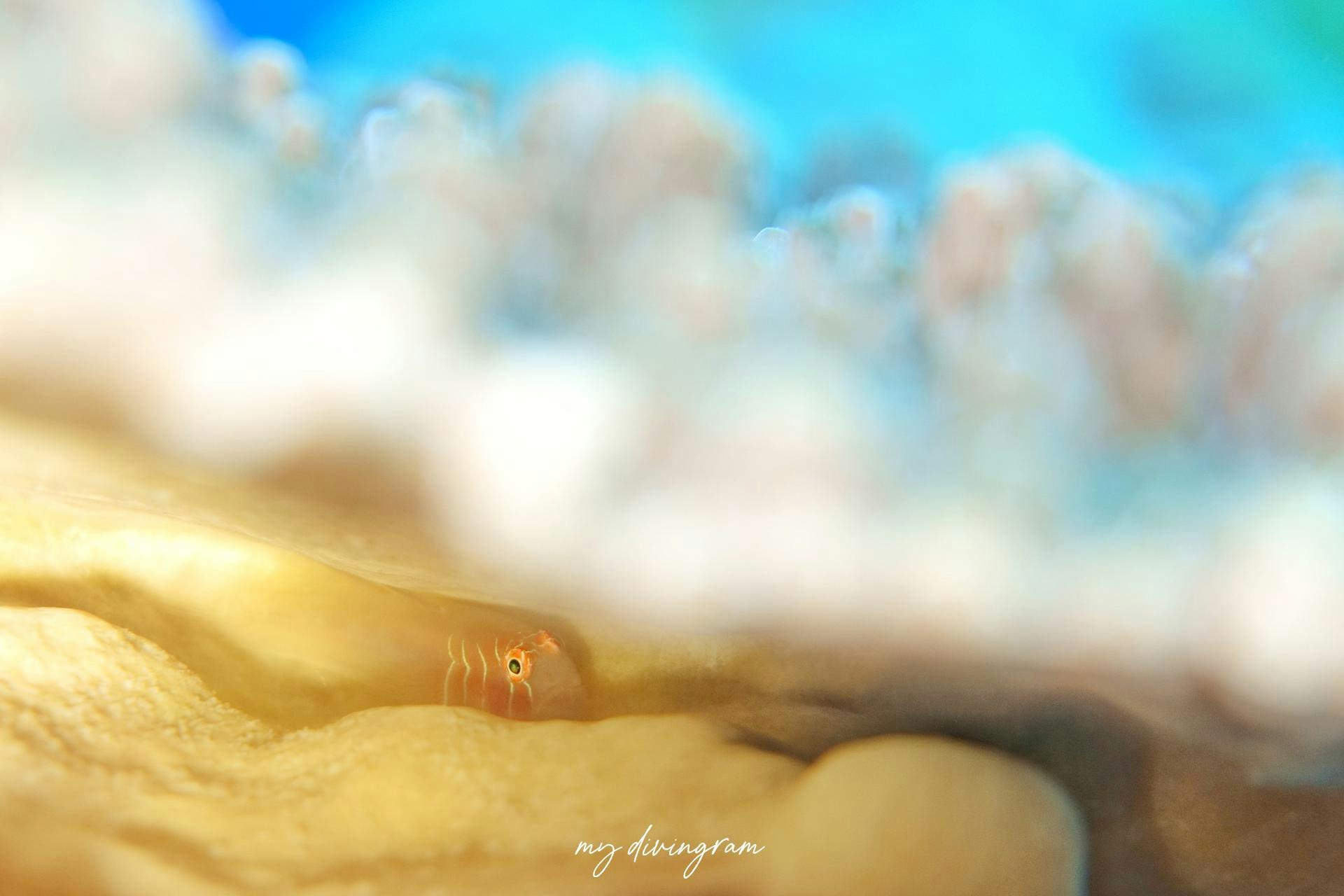 フタイロサンゴハゼとよく似ていますが、体の中央に白色斑点が連なるのが特徴です。