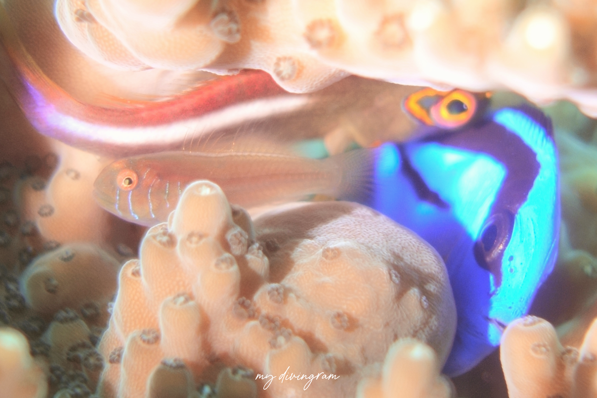 アワイロコバンハゼとナンヨウハギ、メガネゴンベがおしくらまんじゅうしているシーンに遭遇しました。