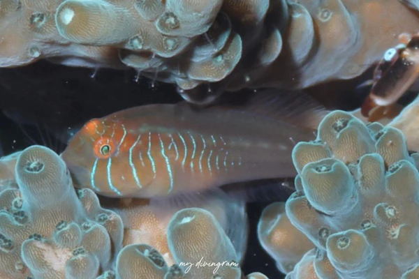 コバンハゼ属の1種-5や1種-8と似ていますが、1-5とは水色横線が赤く縁どられず、眼下に3本の水色垂線がないことで見分けられます。