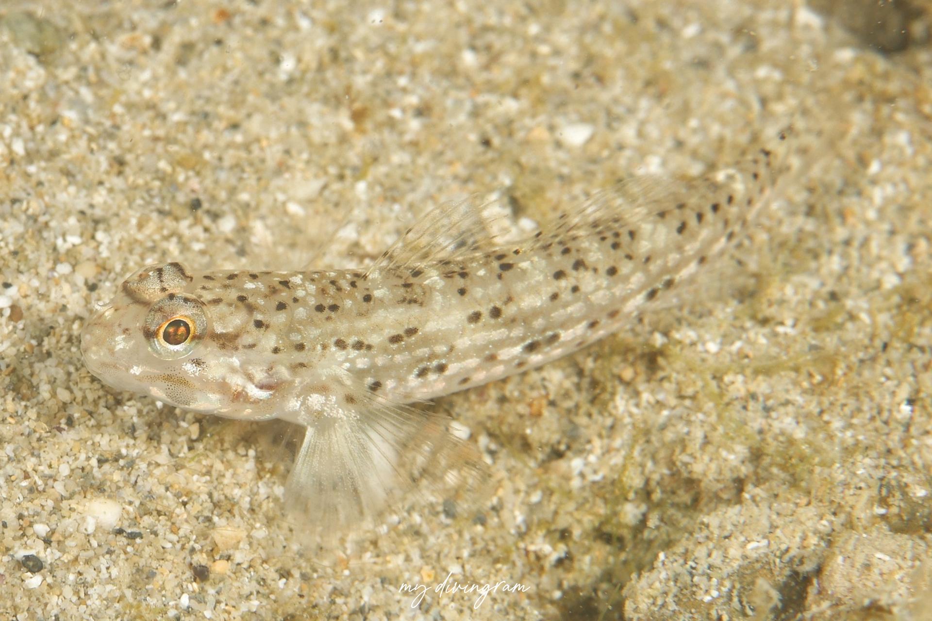 ホシカザリハゼと似ていますが、第1背鰭後方に黒色斑があること、背中側に黒色点が縦列すること、尾鰭基底の斑点がくさび形黒色斑で終わることなどで見分けられます。