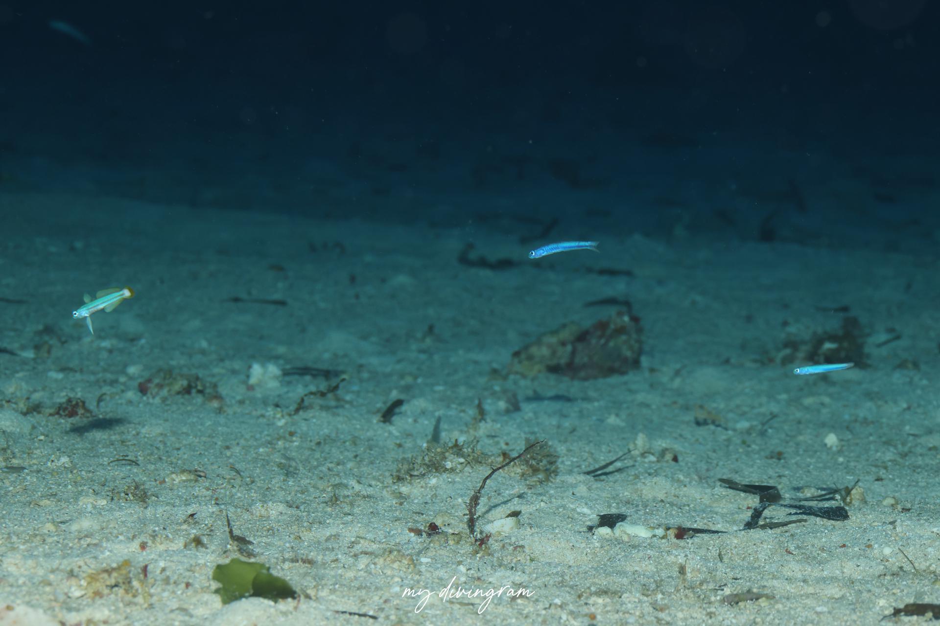 幼魚は体の黒い線が細いこと、尾鰭に黒斑色がないことでリュウキュウハナハゼと見分けられます。