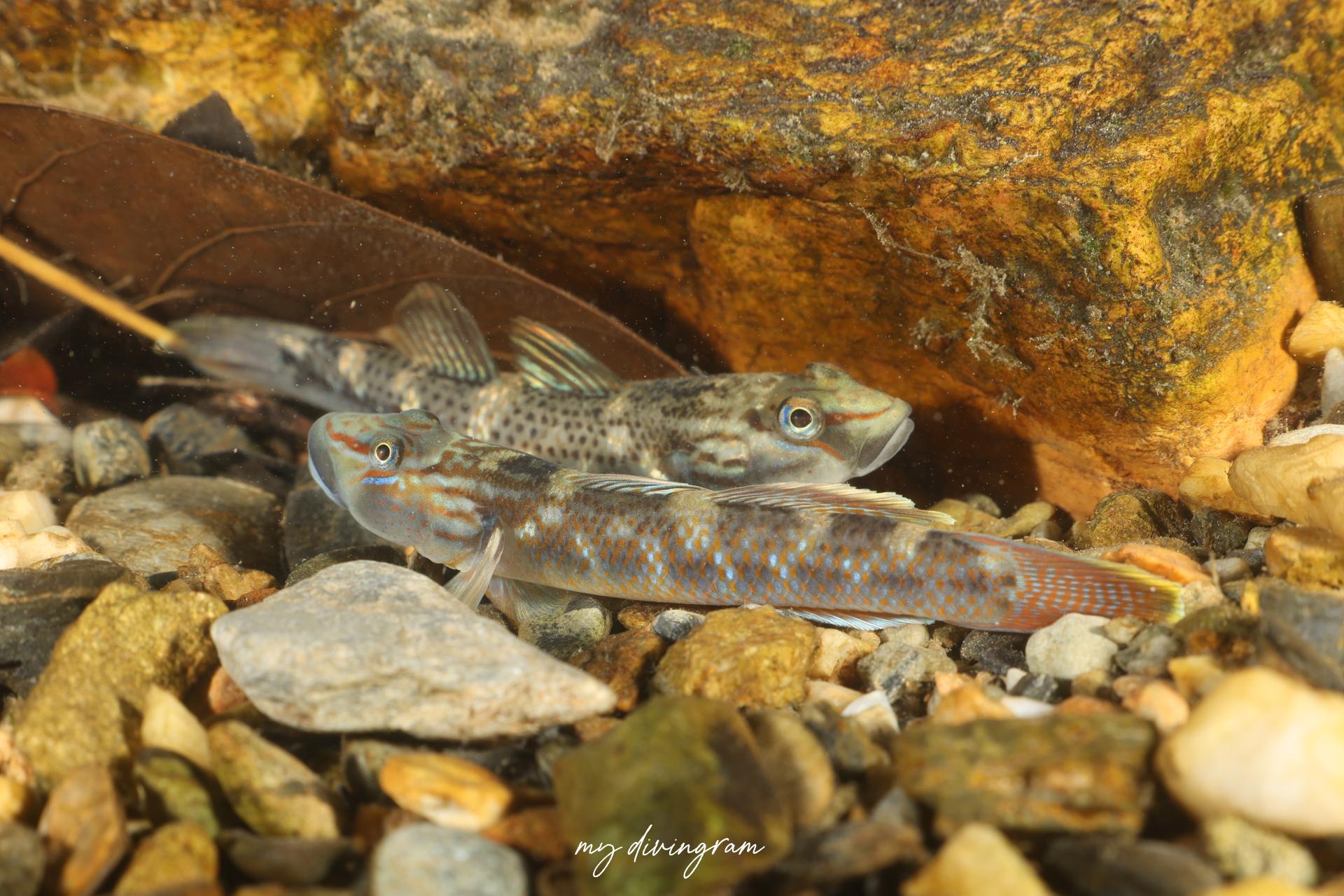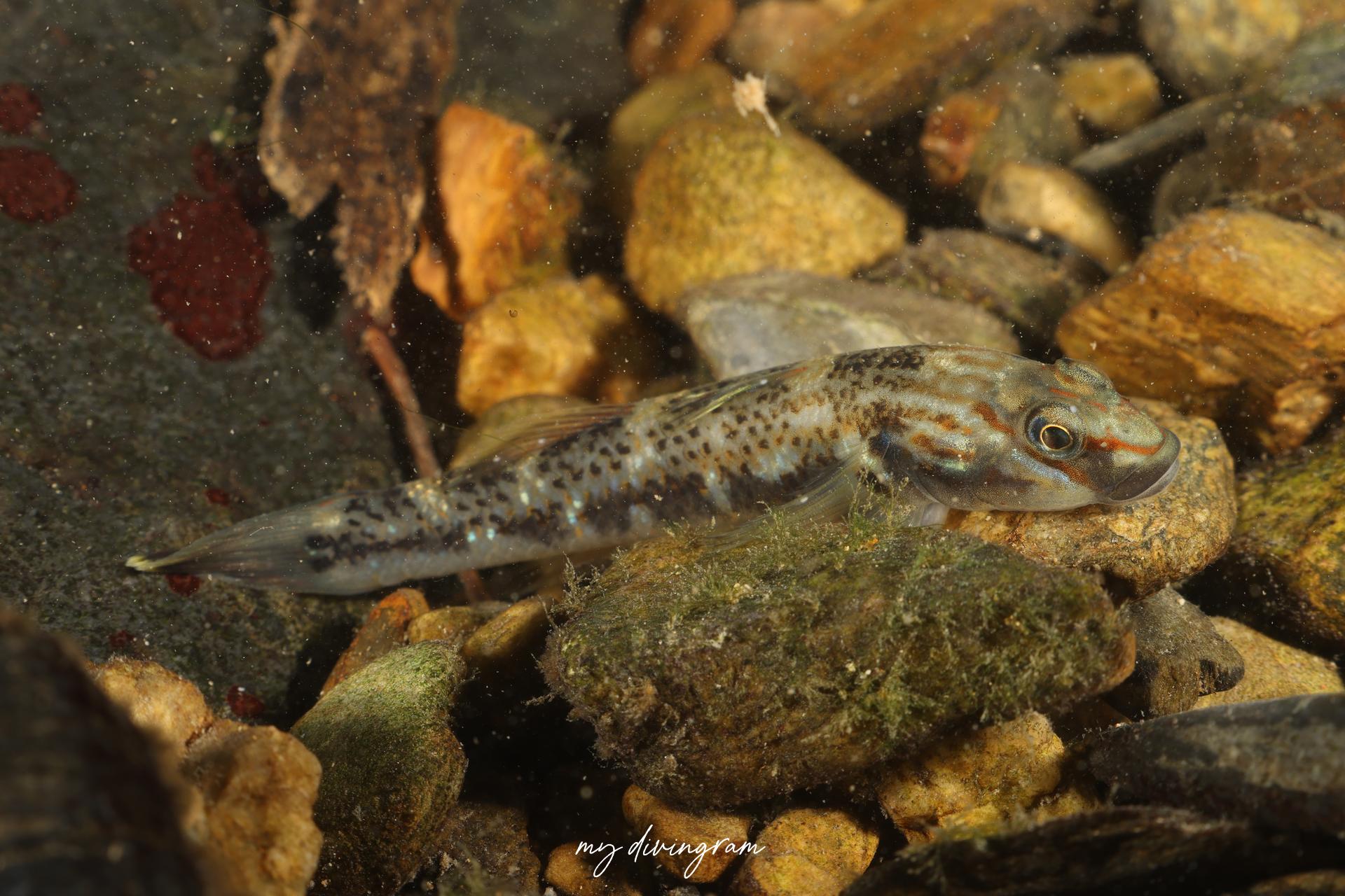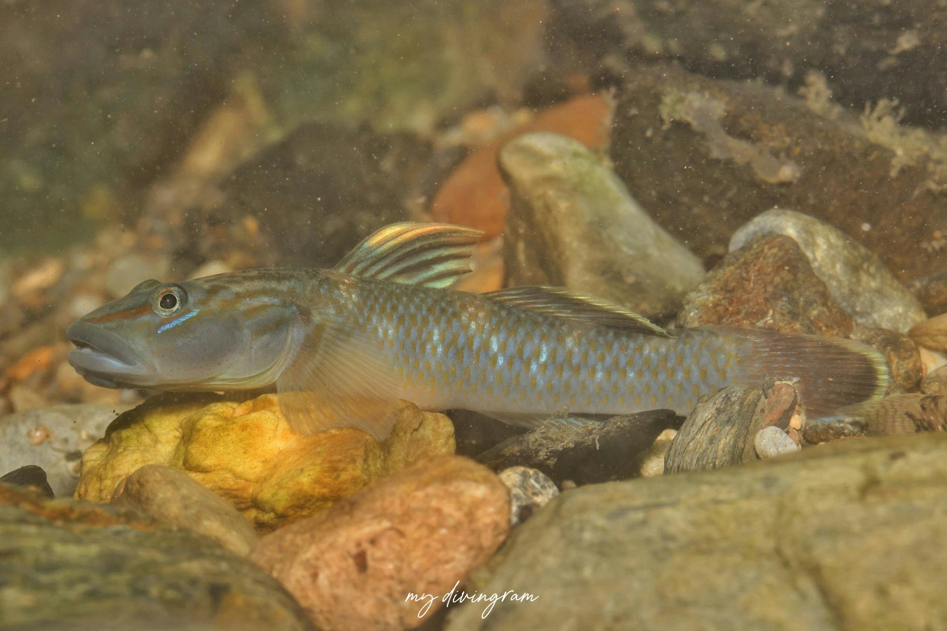 胸鰭基底の大きな三日月状斑と尾鰭基部の八の字状斑が特徴のヨシノボリです。