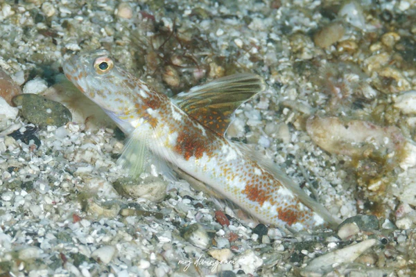 オニハゼ属sp1-3とよく似ていますが、背鰭が高い台形であることや背鰭前半が斑点ではなく斜線であることなどで見分けられます。