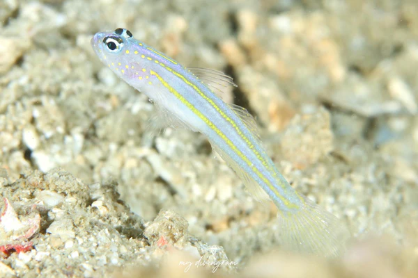 水色の体色に黄色のラインが2本走る、珍しい色彩のヤツシハゼです。