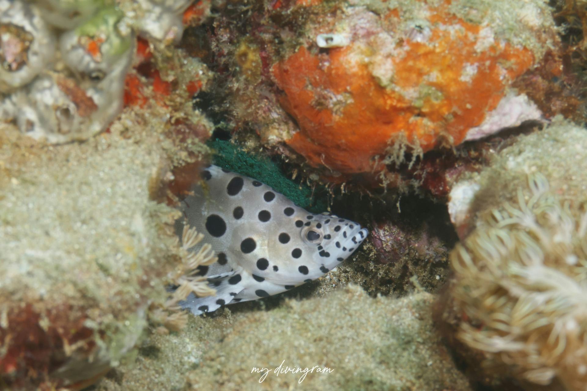 魚に詳しくないガイドが指さしたと思ったら脅かすジェスチャーで引っ込めようとしたので、ちょちょちょいまてーいとなりました。
