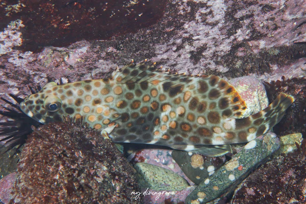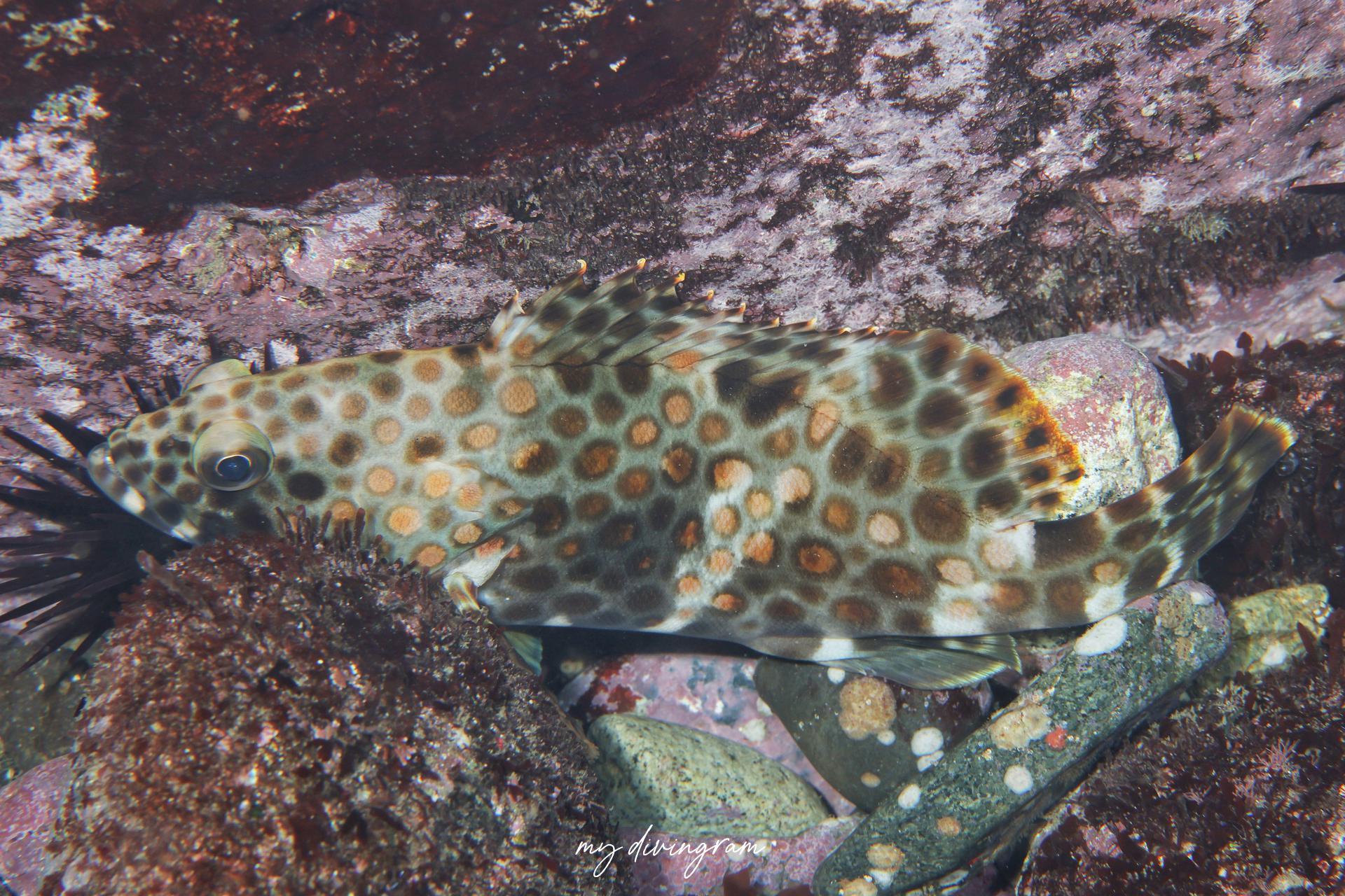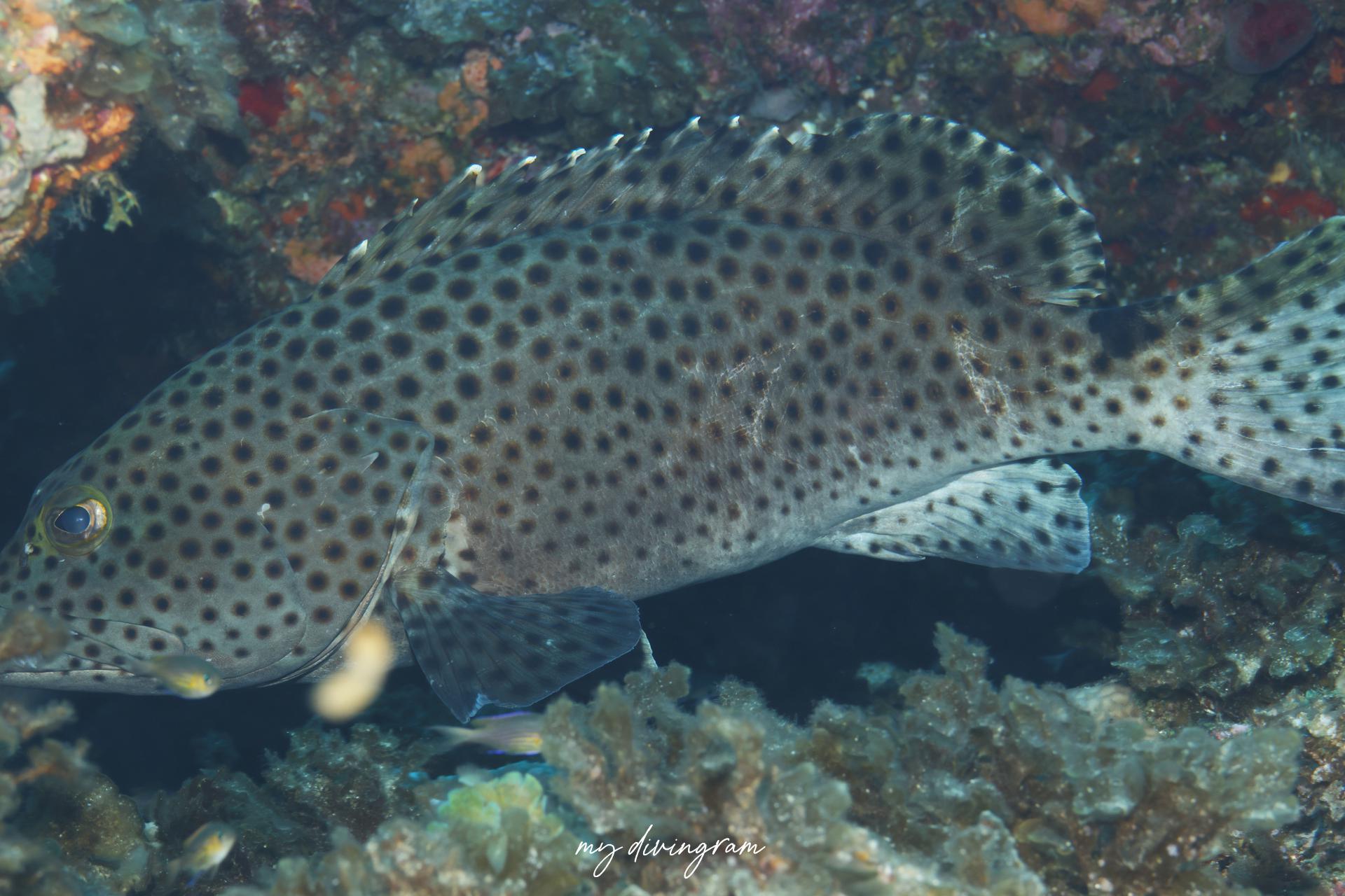 ヒレグロハタやヒトミハタに似ていますが、体の背縁には黒色斑がないことや胸鰭には密な斑点がないことで見分けられます。