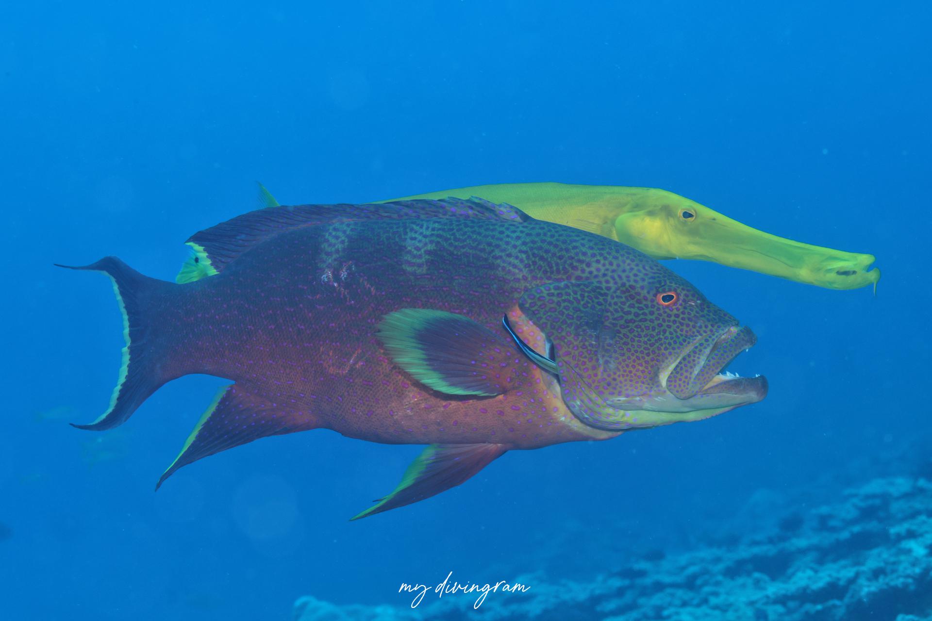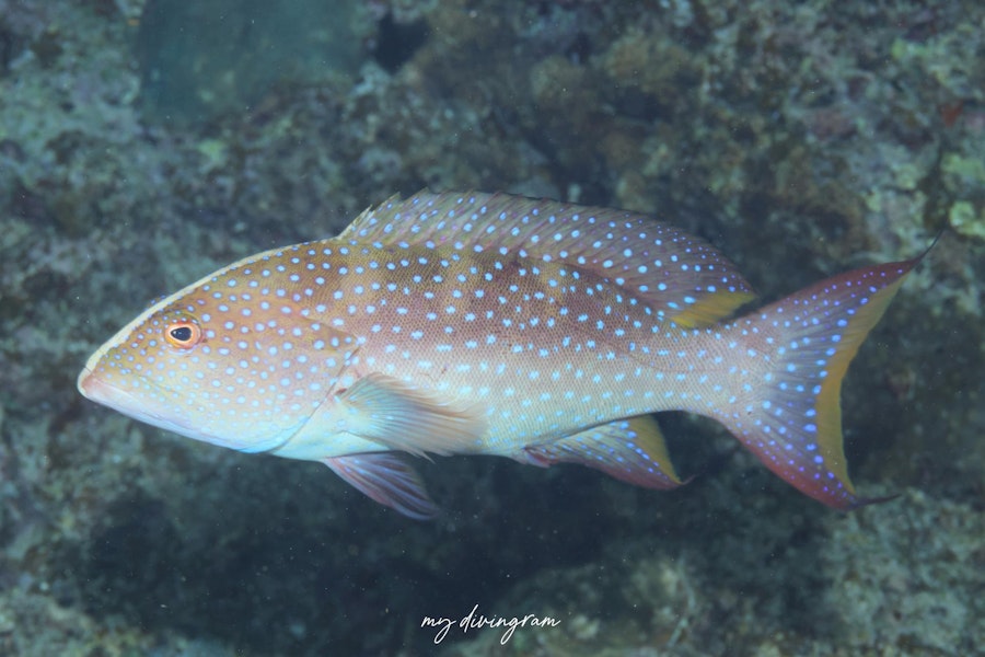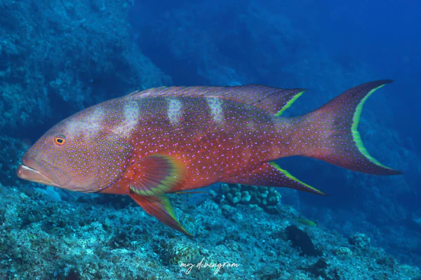 よく似たオジロバラハタとは尾鰭後縁が白くないことで見分けられます。