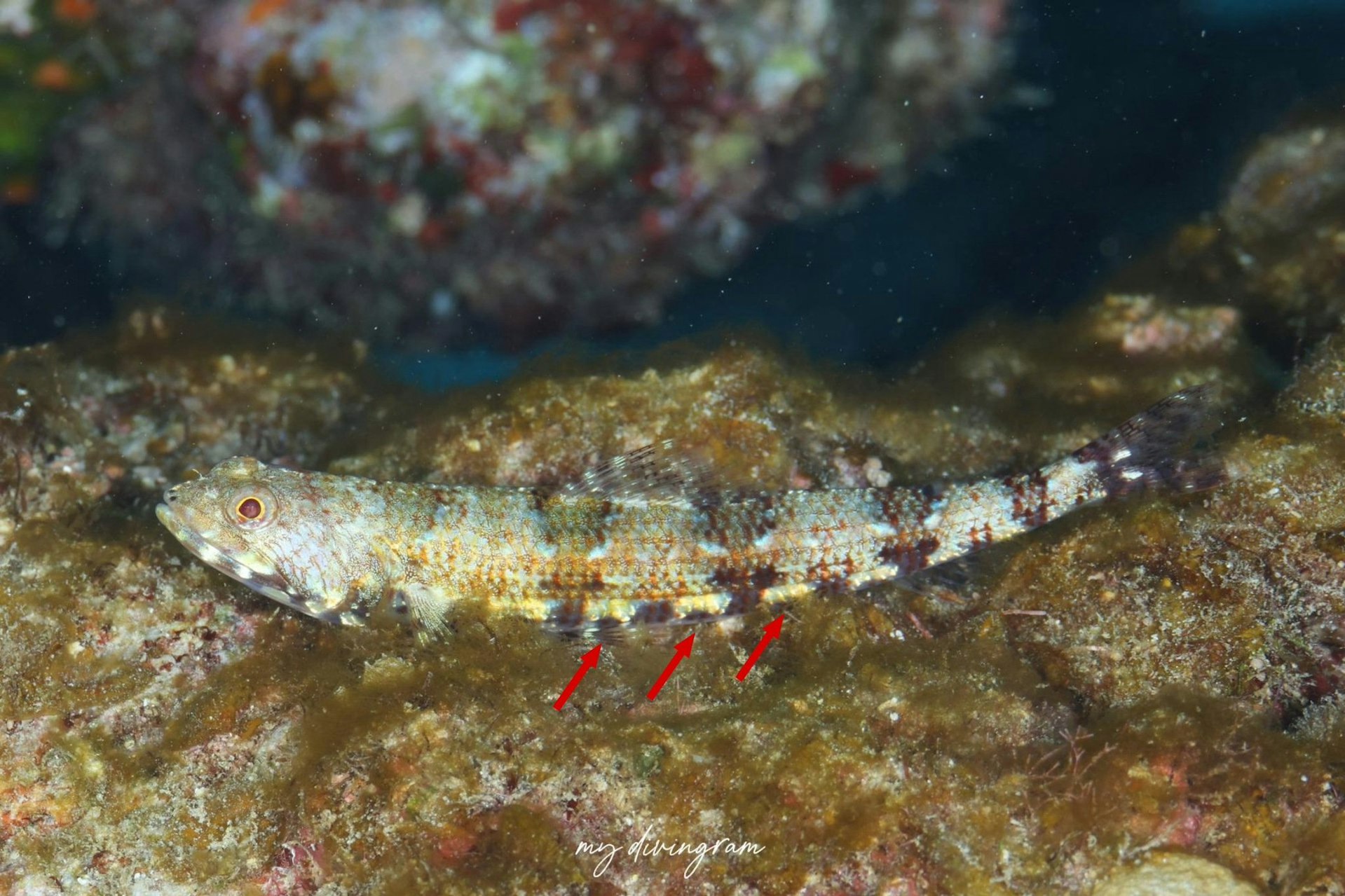 ニテンエソはお腹に黒色斑 (写真の赤矢印) が並んでいることで、これが無いヒトスジエソと見分けられるようです。