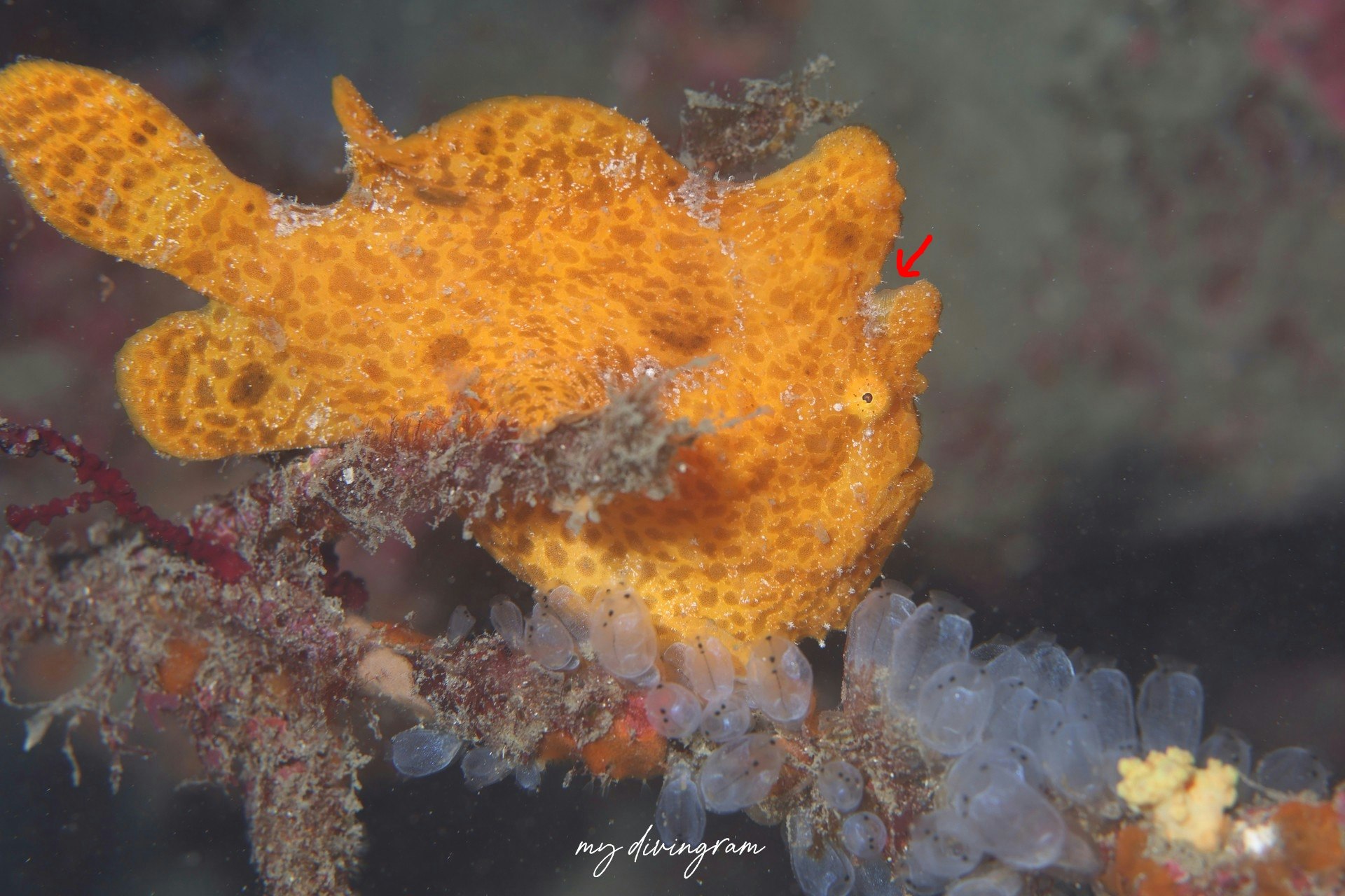 背鰭第2棘 (眼の真上) を覆う皮膚が肥大して鰭膜との境界が曖昧になっていることが特徴です。