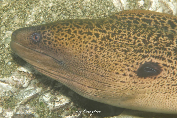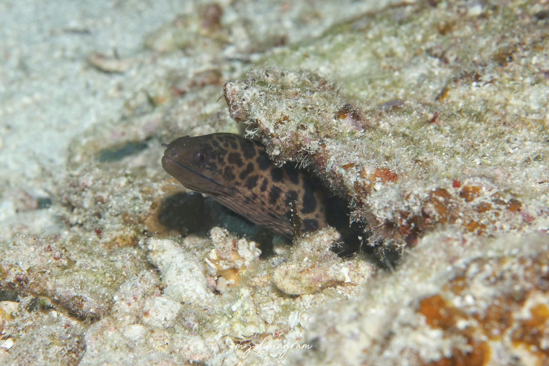 光彩の色が茶色なこと、体の黒色斑がやや大きいことから、よく似たゴマウツボと見分けられます。